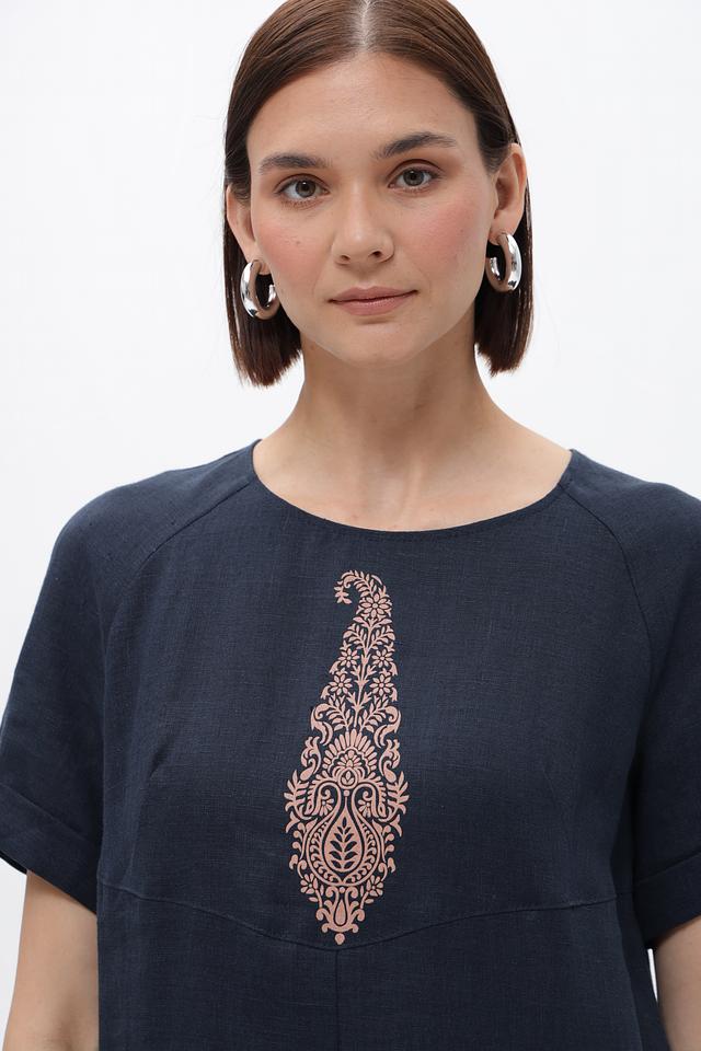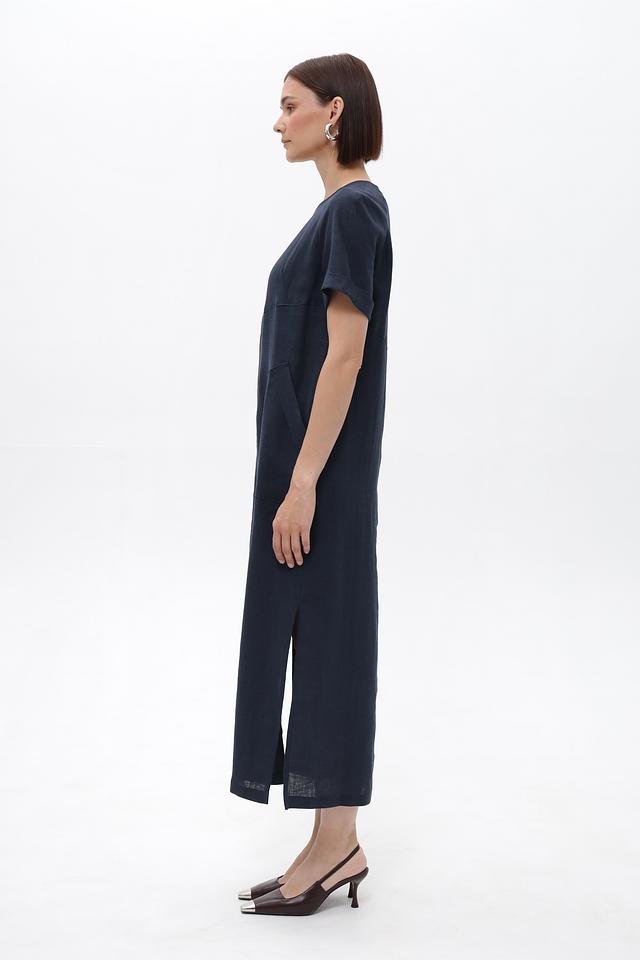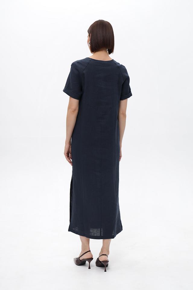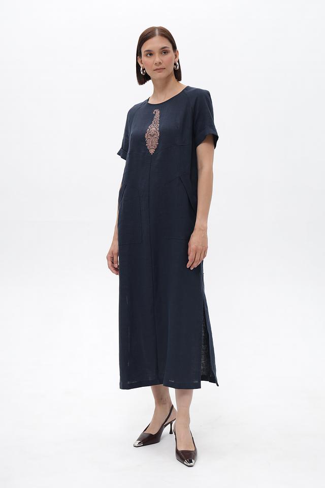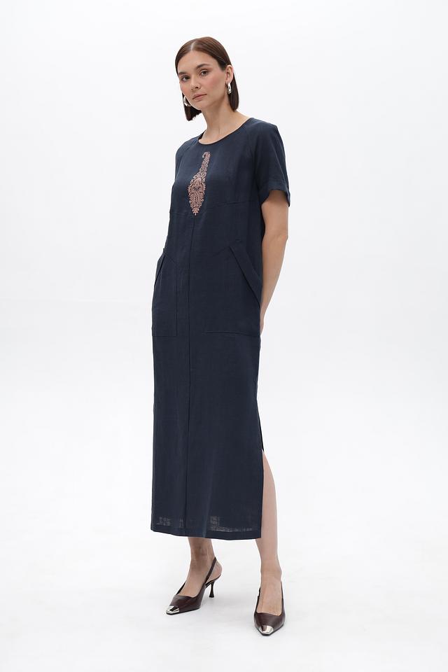 Платье Electra style темно-синего цвета, выполнено из 100% льна и украшено вышивкой. Модель свободного кроя с короткими рукавами и боковым разрезом, идеально подходит для создания комфортных и стильных образов. Состав: лен 100%