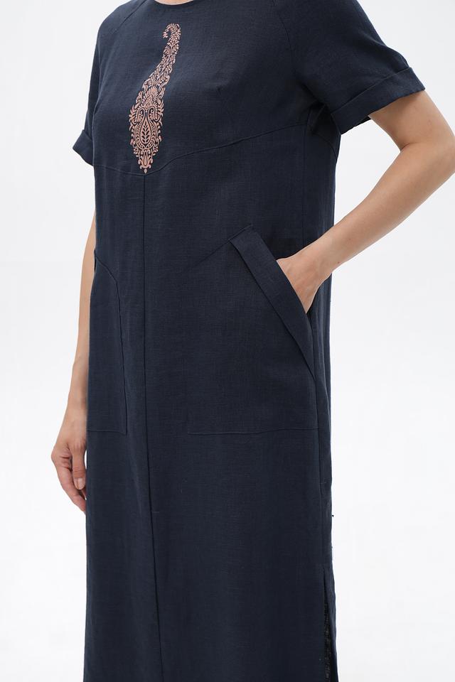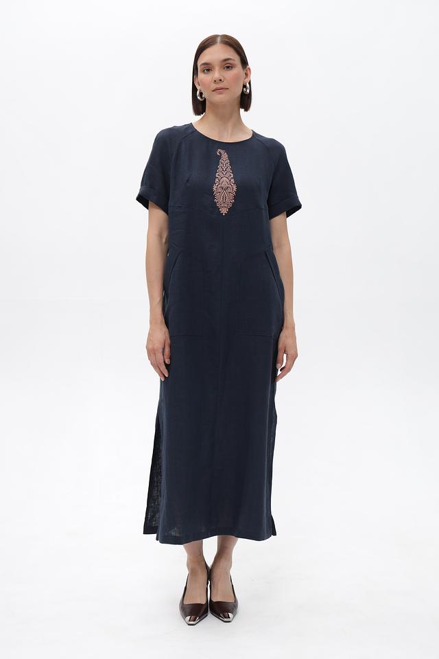 Это платье от Electra style выполнено из натурального льна, что обеспечивает комфорт и воздухопроницаемость в жаркую погоду. Основной цвет платья – темно-синий, который отлично сочетается с вышивкой в приглушенных тонах, расположенной на груди.