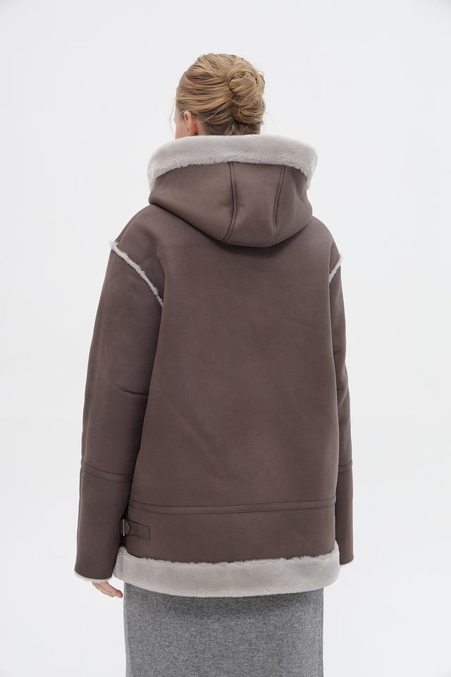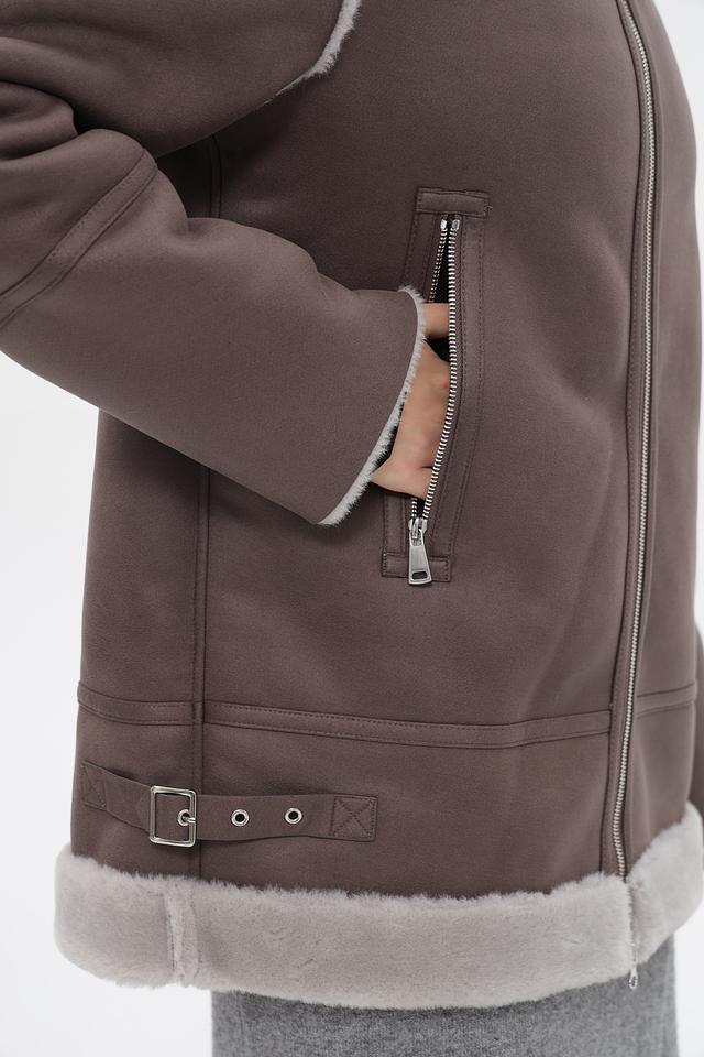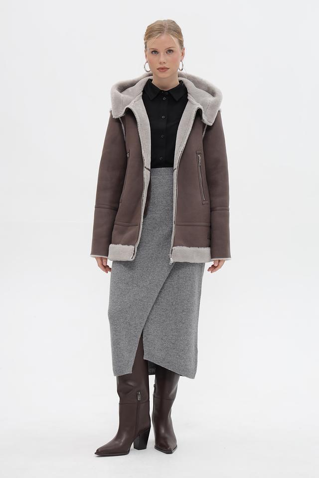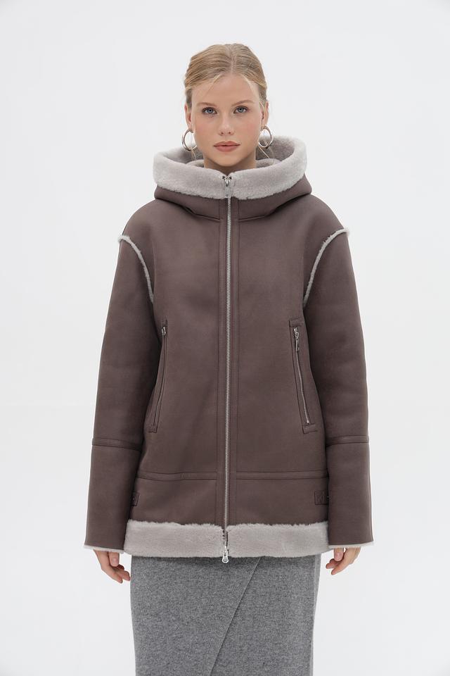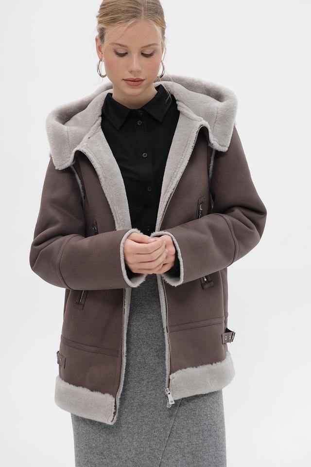 Дублёнка выполнена из смеси шерсти, вискозы и акрила, что обеспечивает тепло и комфорт в холодное время года. Меховая отделка капюшона и нижней части куртки добавляет изделию мягкости и уюта. Боковые карманы на молнии обеспечивают удобство хранения необходимых мелочей.