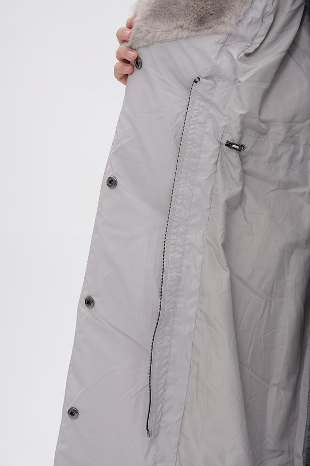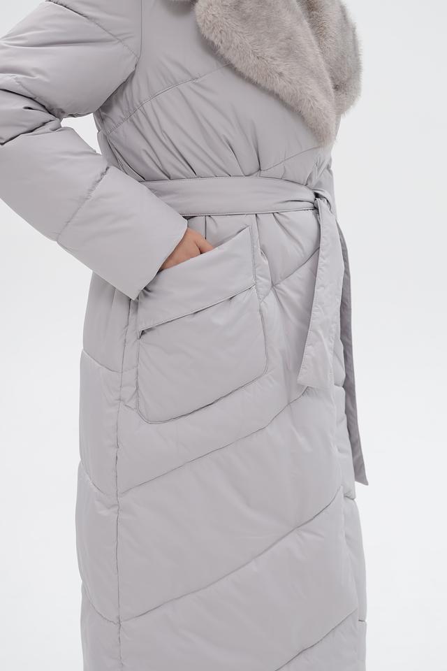 Модель оснащена высоким меховым воротником, который обеспечивает дополнительное тепло и комфорт в холодную погоду. Пальто застегивается на кнопки, а также имеет пояс, который позволяет подчеркнуть талию и создать более женственный силуэт.