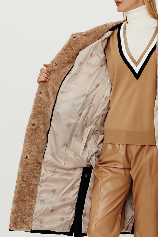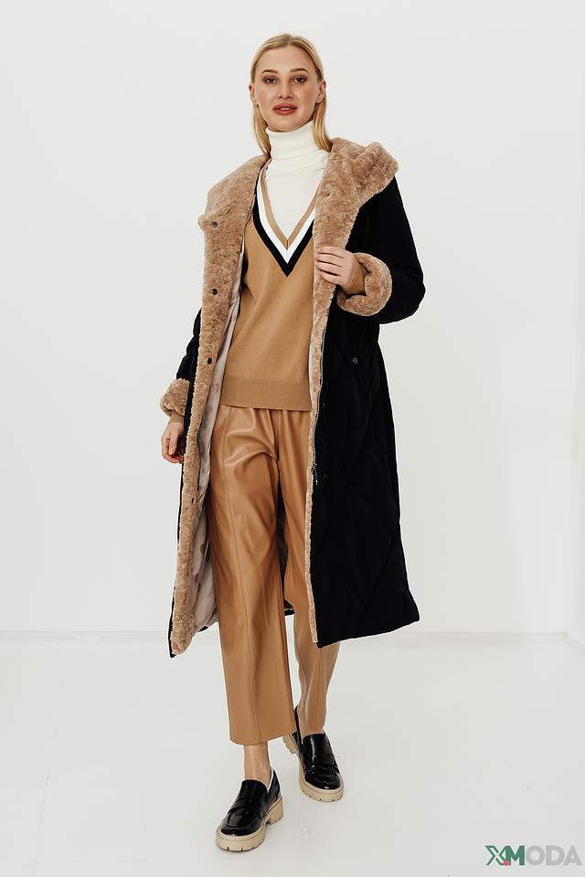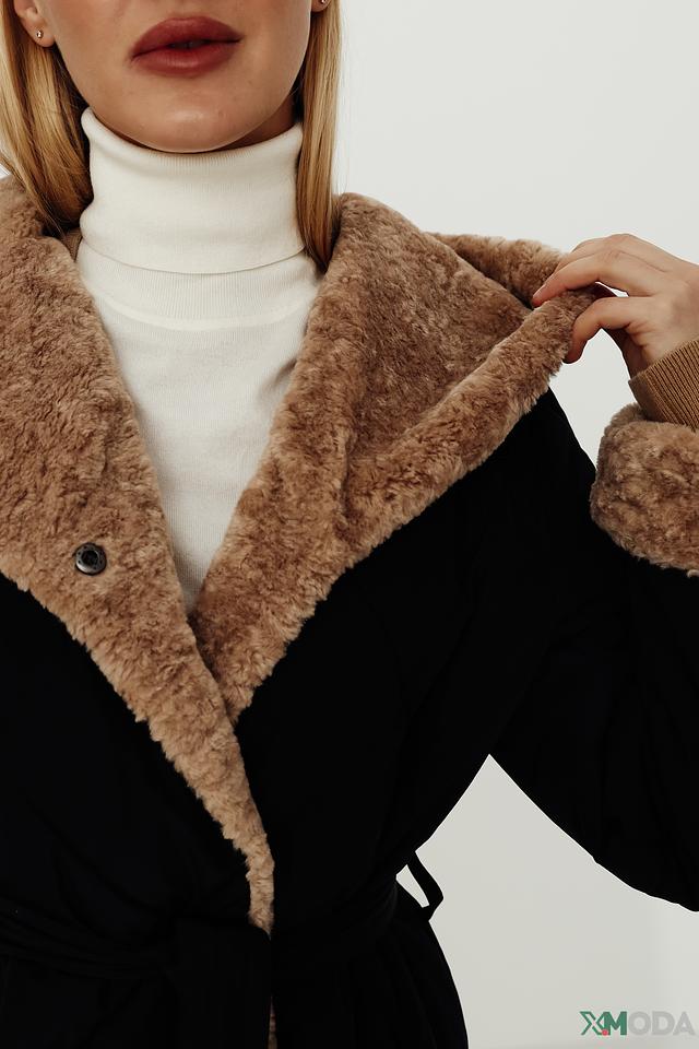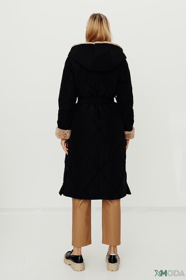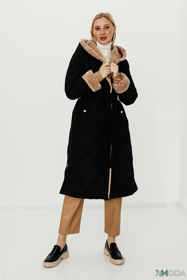 Особенностью данной модели является стеганая фактура, которая придает ей современный и стильный вид. Капюшон и воротник отделаны мягким искусственным мехом бежевого оттенка, что добавляет пальто уют и роскошь.