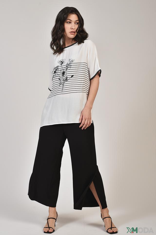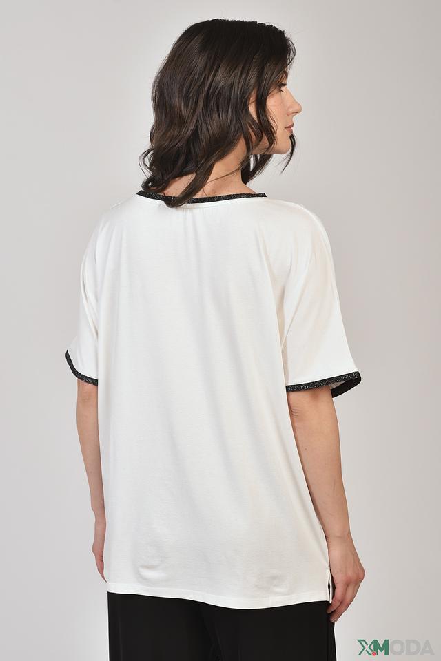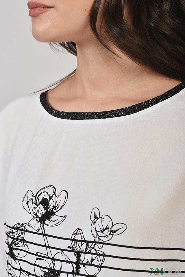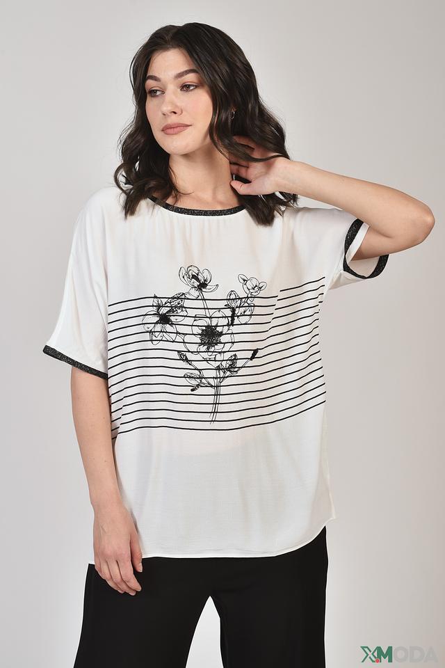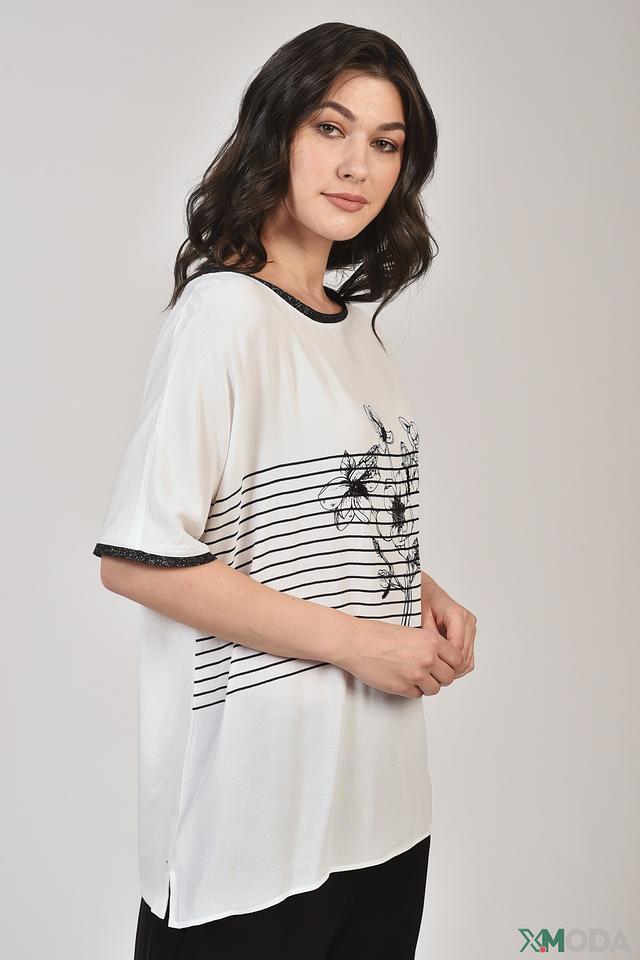 Белая футболка Elena Miro с оригинальным цветочным принтом и отделкой черной тесьмой. Модель свободного кроя выполнена из мягкой вискозы с добавлением эластана для комфорта и удобства. Состав: вискоза 95%, эластан 5%