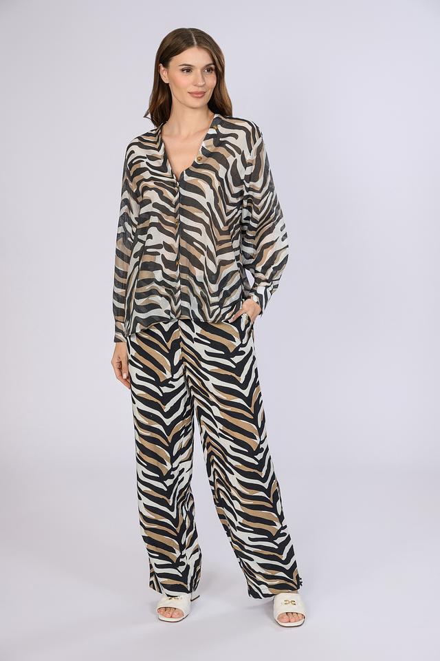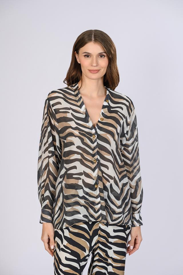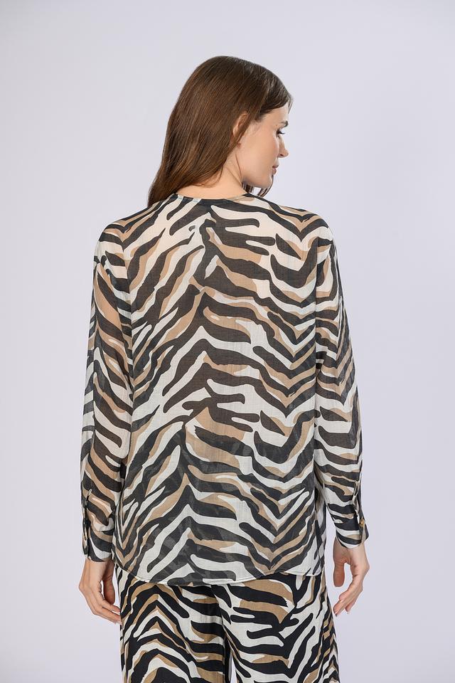 Особенностью данной модели является оригинальный принт в виде полоски, выполненный в сочетании оттенков хаки, бежевого и белого. Этот рисунок делает блузу яркой и запоминающейся. Блуза идеально сочетается с брюками, юбками и джинсами, позволяя создавать разнообразные образы.