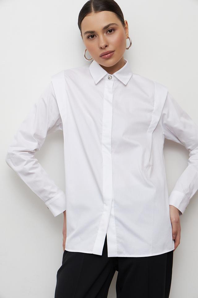 Белая блуза от Emka с оригинальным фигурным воротником. Классический крой и 100% хлопковый состав обеспечивают комфорт и элегантный вид. Идеально подходит для создания стильных образов. Состав: хлопок 100%