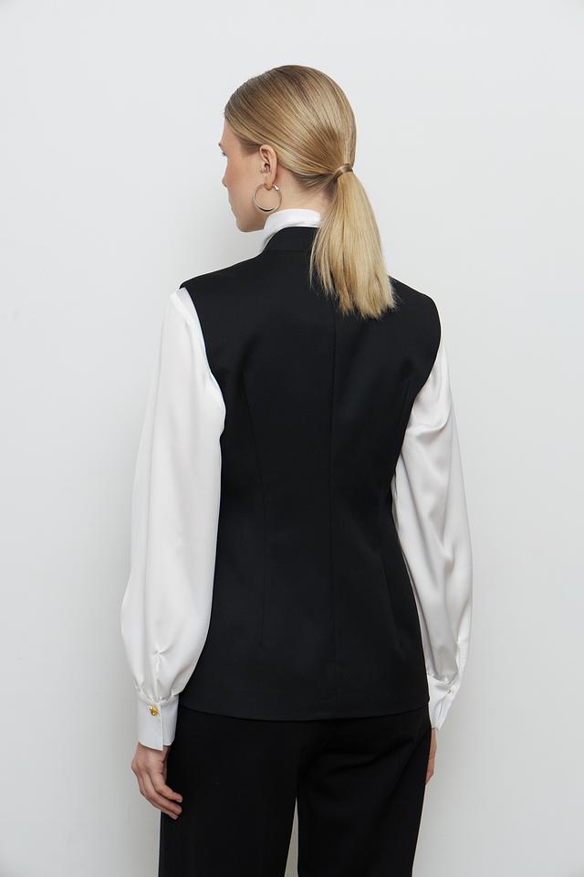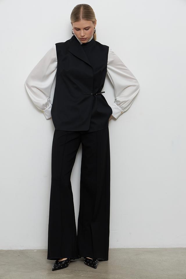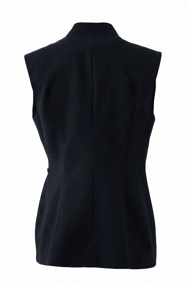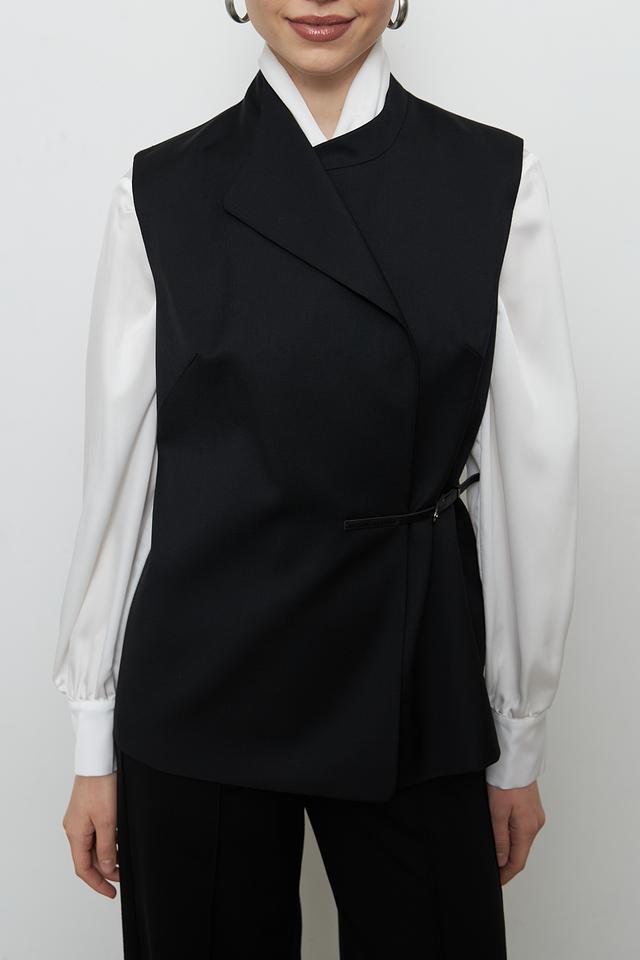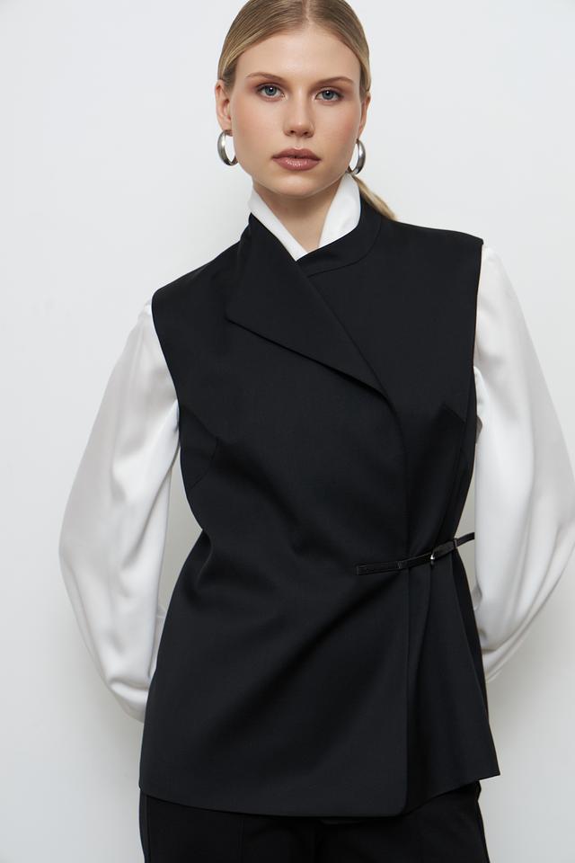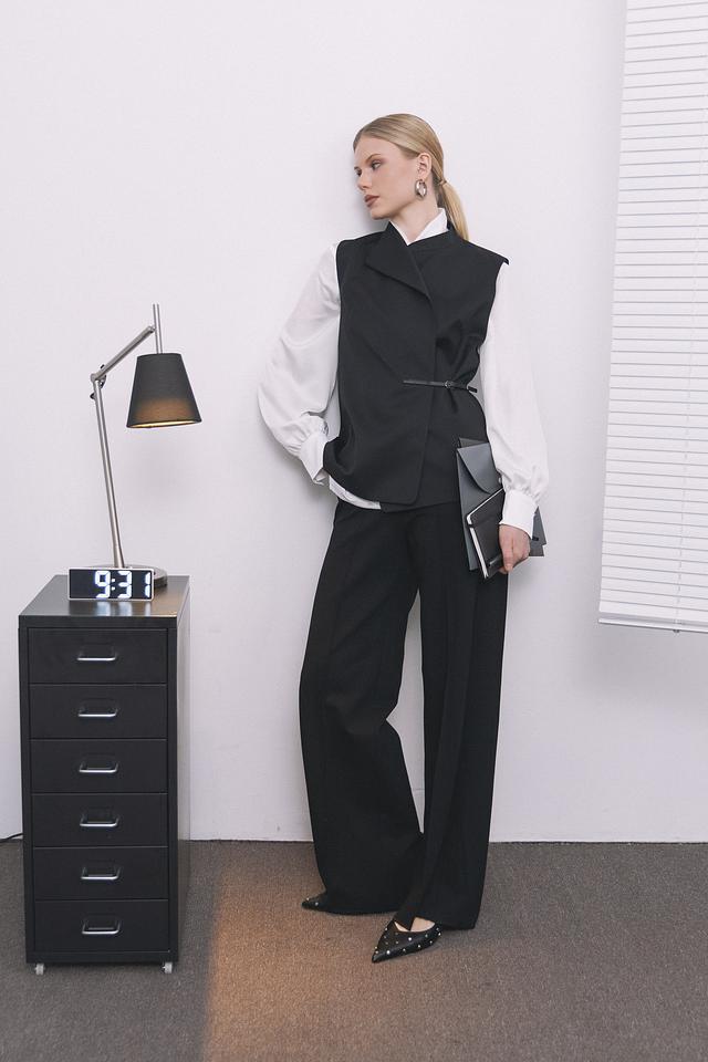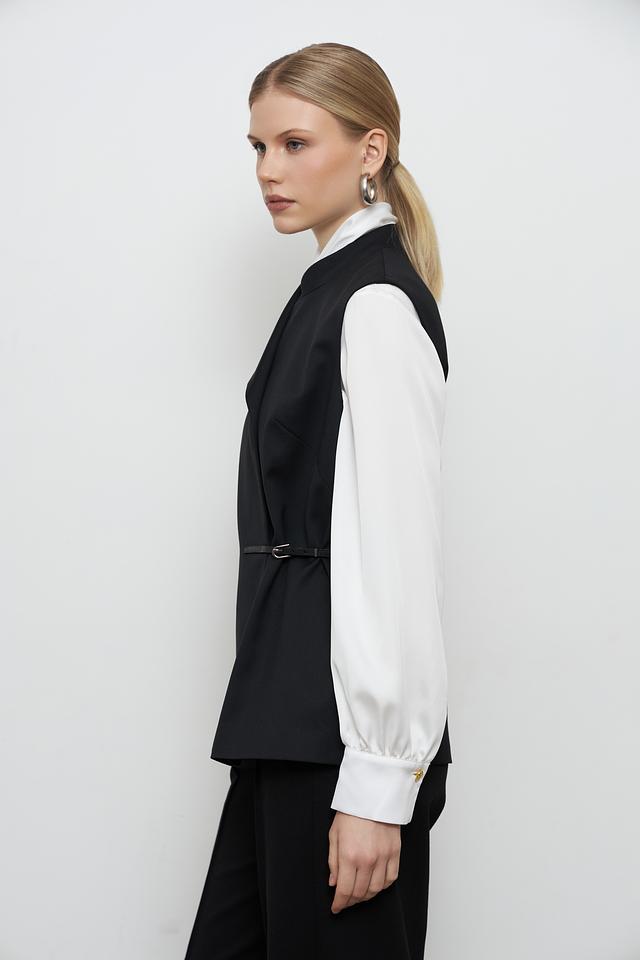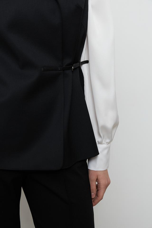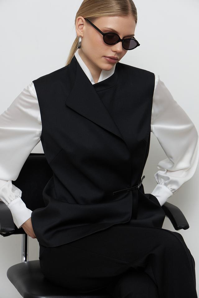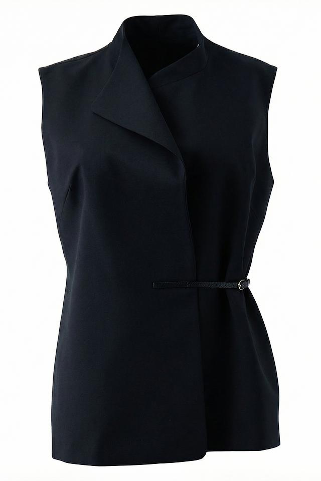 Жилет имеет классический крой с лацканами и V-образным вырезом, что придает ему элегантный вид. Акцентный пояс подчеркивает талию и создает женственный силуэт. Застежки отсутствуют, жилет надевается нараспашку.