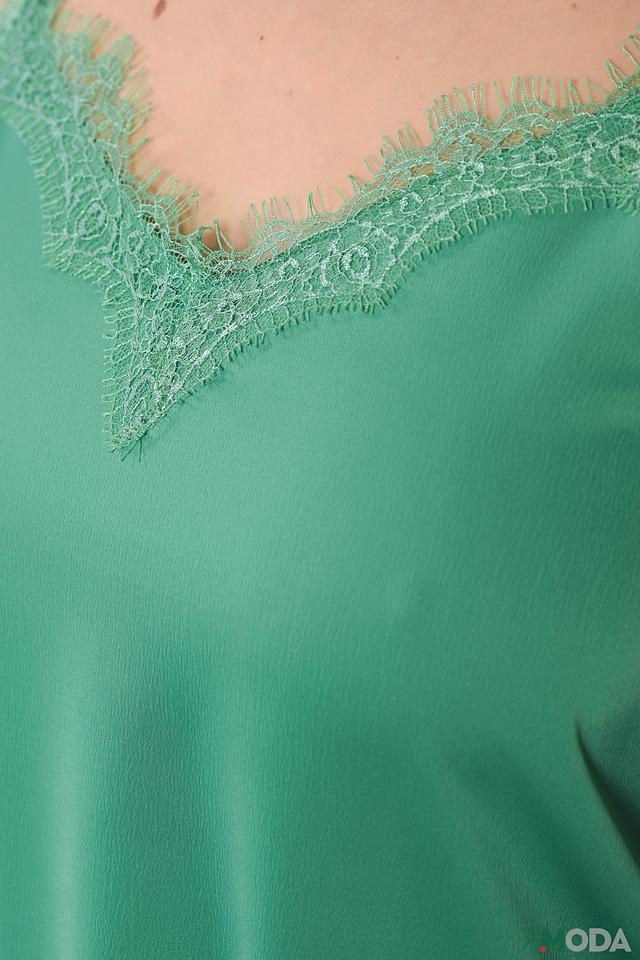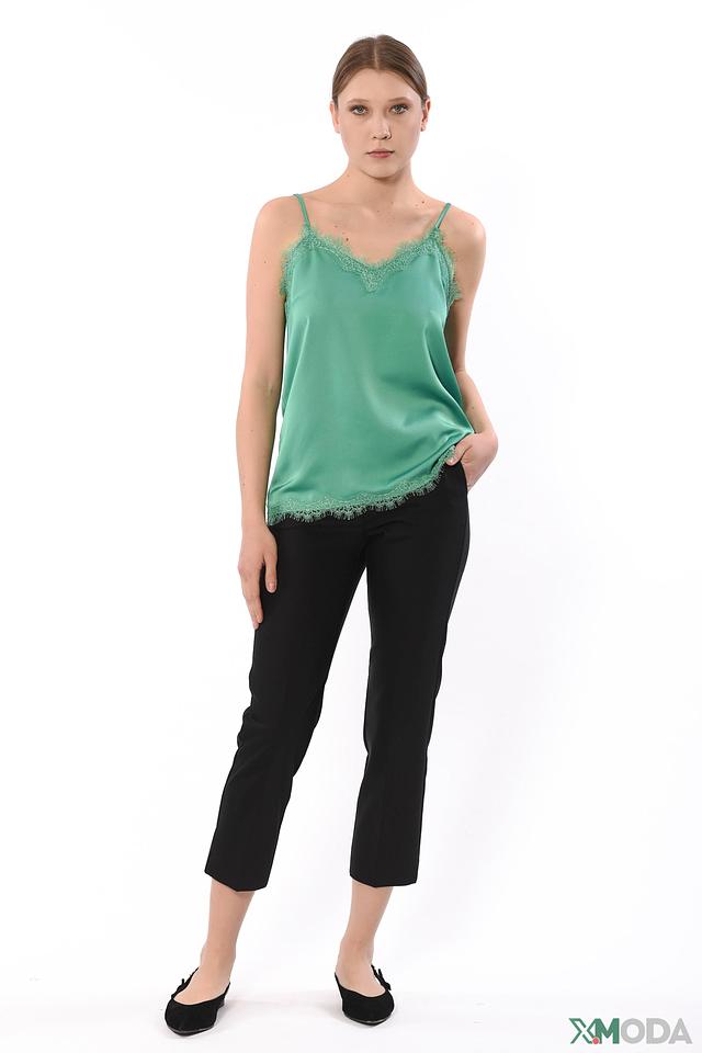 Модель имеет прямой крой и тонкие бретели, что придает ей женственность и изящество. Отличительной особенностью блузы является кружевная отделка по горловине и нижнему краю, добавляющая романтичности образу.
