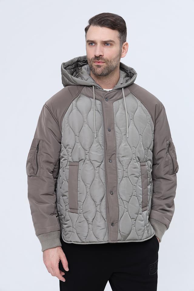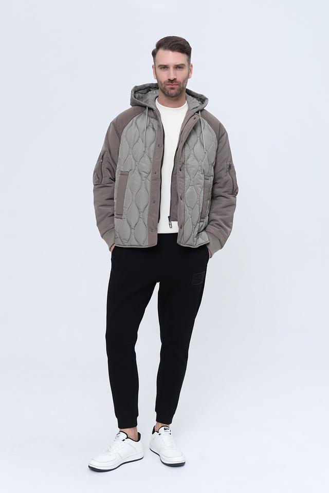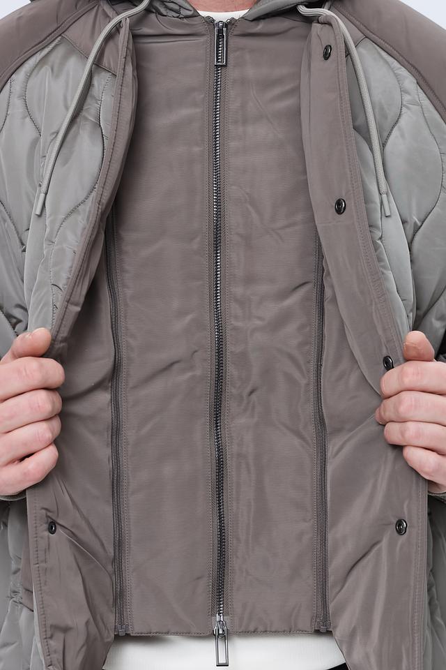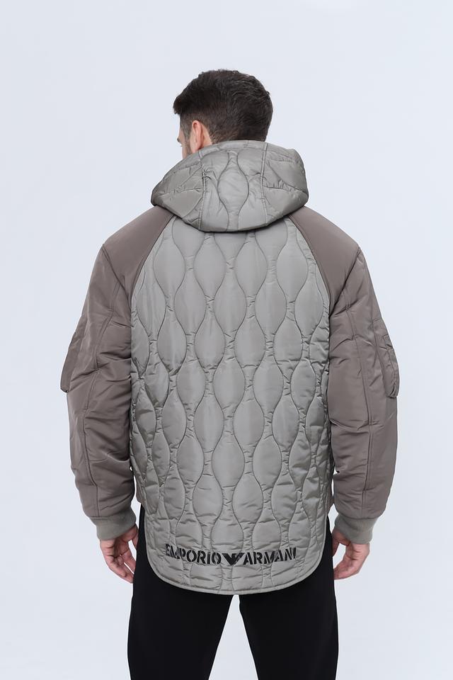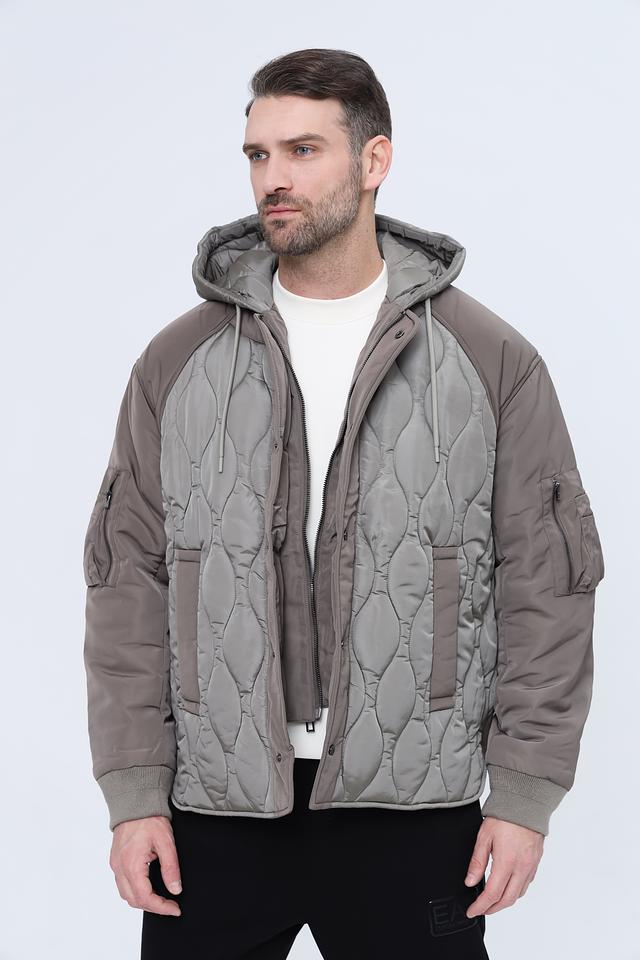Стильная мужская куртка Emporio Armani серого цвета с комбинированным дизайном и стеганой фактурой. Модель с капюшоном и удобными карманами станет отличным дополнением к вашему гардеробу. Состав: полиамид 100%