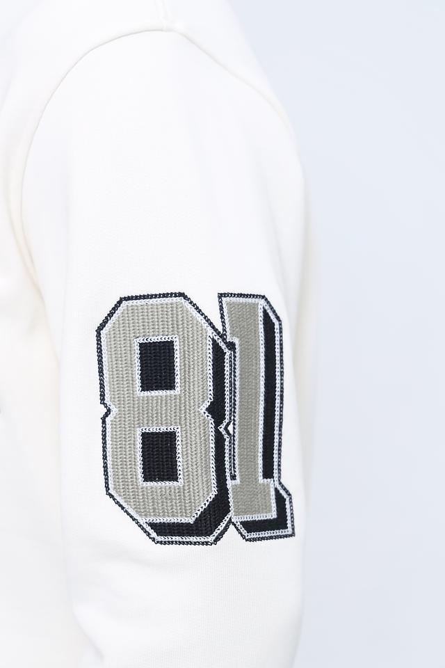 Дизайн джемпера включает в себя крупные элементы с логотипом бренда, выполненные в контрастных цветах. На груди расположен логотип "Emporio Armani", а на спине – надпись "1981" и "Milano", выполненные в ретро-стиле. Дополнительные декоративные элементы в виде полос на рукавах придают джемперу спортивный вид.