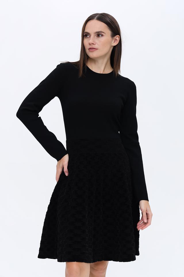 Черное платье от Emporio Armani с комбинированной текстурой верха и юбки. Модель имеет длинные рукава и приталенный силуэт, идеально подходит для создания элегантного образа. Состав: полиэстер 84%, вискоза 16%