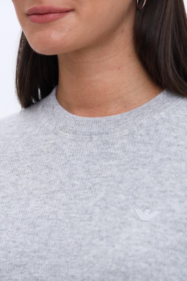 На груди расположен небольшой логотип бренда Emporio Armani, который подчеркивает статусность изделия. Джемпер имеет круглый вырез горловины и длинные рукава. Он идеально подойдет для создания повседневных образов, а также для более формальных мероприятий в сочетании с подходящими аксессуарами.