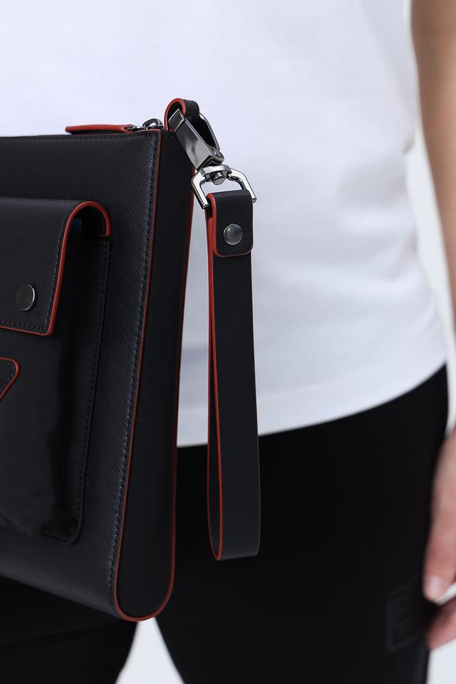 Клатч изготовлен из высококачественного полиуретана, что обеспечивает его долговечность и устойчивость к износу. Внешний вид клатча дополнен контрастными красными элементами, которые придают ему современный и узнаваемый вид. Передняя часть украшена фирменным логотипом бренда.