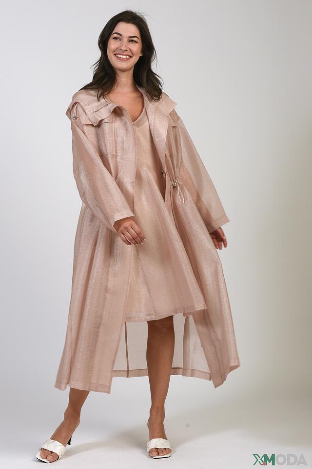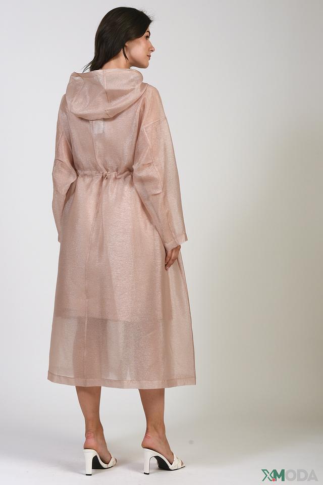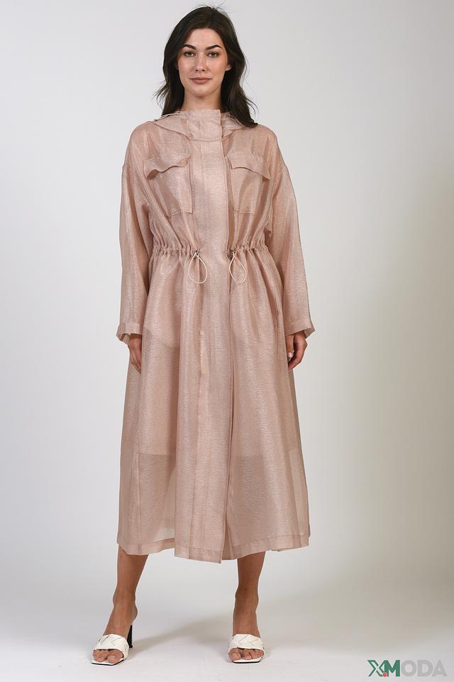 Женское пальто Emporio Armani нежно-розового цвета выполнено из полиэстера с лёгким металлическим блеском. Модель имеет свободный крой, капюшон и завязки на талии, что позволяет регулировать силуэт. Состав: полиэстер 100%