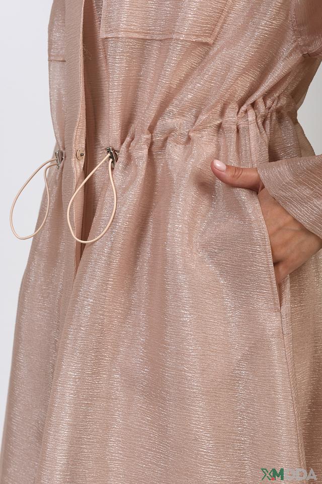 Ткань пальто обладает лёгким металлическим блеском, придающим изделию изысканный вид. Это пальто идеально подойдёт для создания стильных и комфортных образов в прохладную погоду. Универсальная длина позволит сочетать его с различной обувью и аксессуарами.