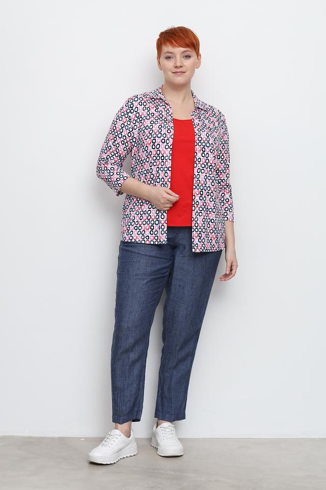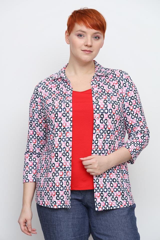 Рубашка имеет прямой крой и короткий рукав, что делает ее идеальным выбором для теплой погоды. Особенностью модели является яркий и оригинальный геометрический принт, выполненный в сочетании розовых, красных и черных оттенков на белом фоне.
