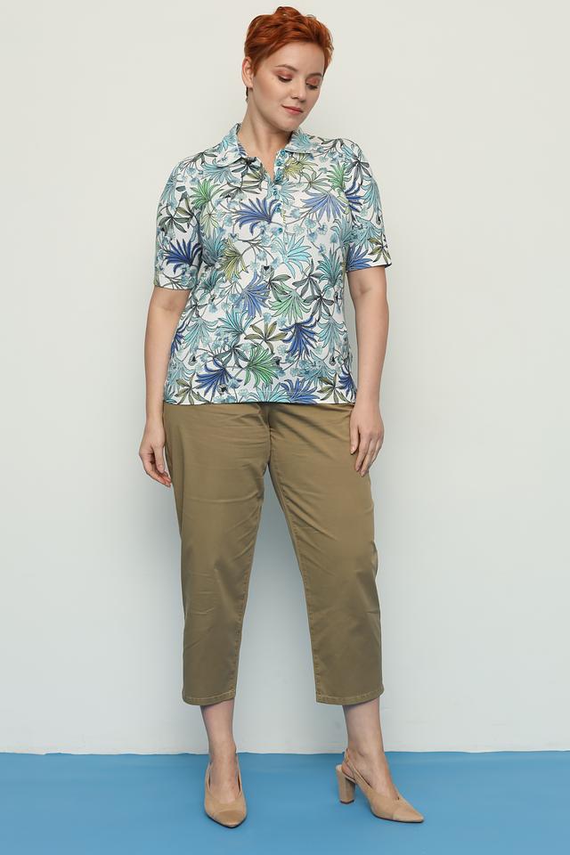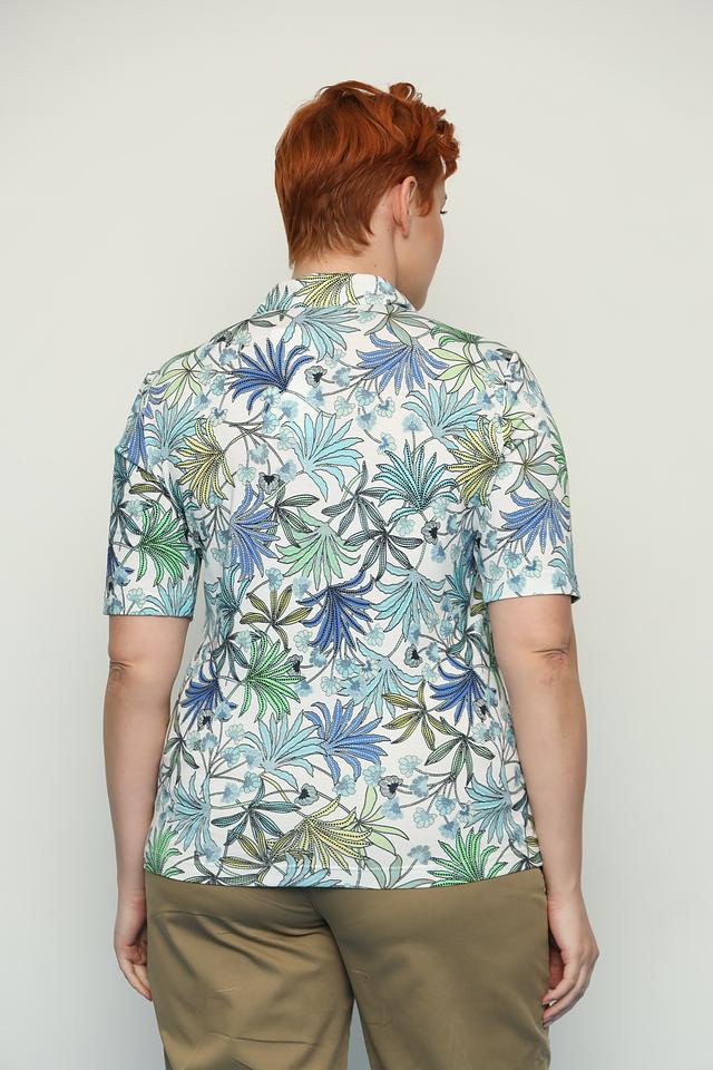 Основным акцентом блузы является яркий и красочный тропический принт, который состоит из различных оттенков зеленого, синего и белого. Такой рисунок добавит образу свежести и легкости, идеально подходя для летних дней.