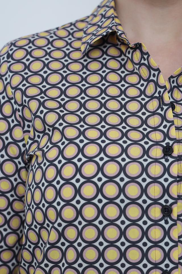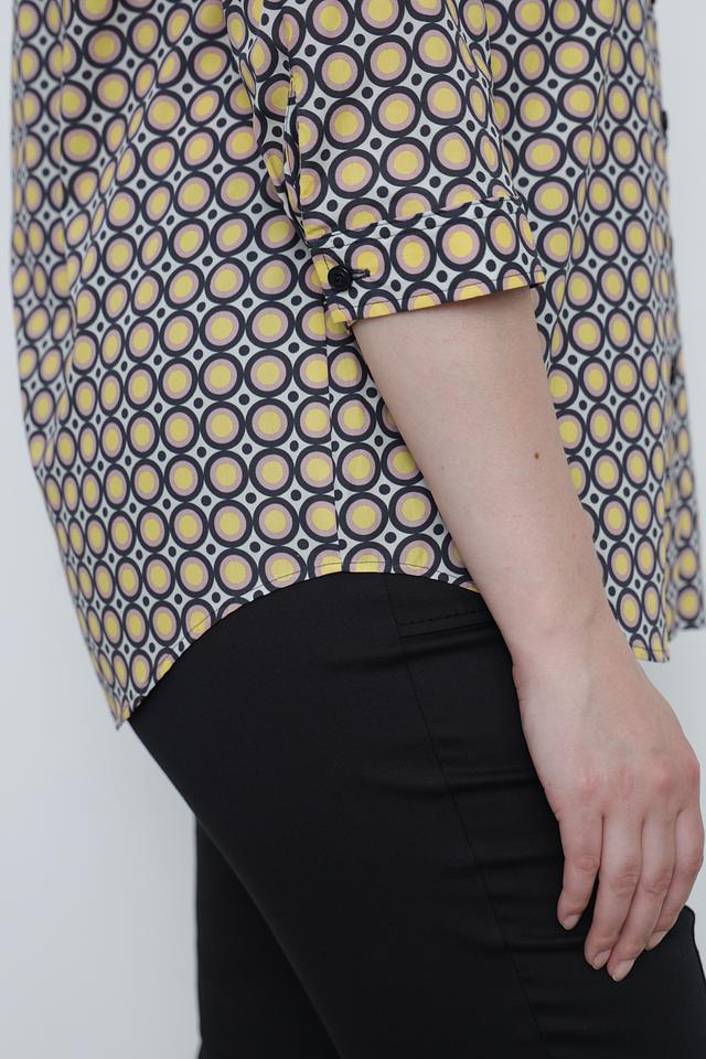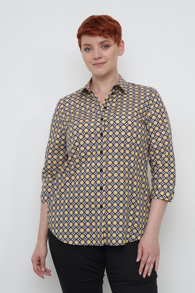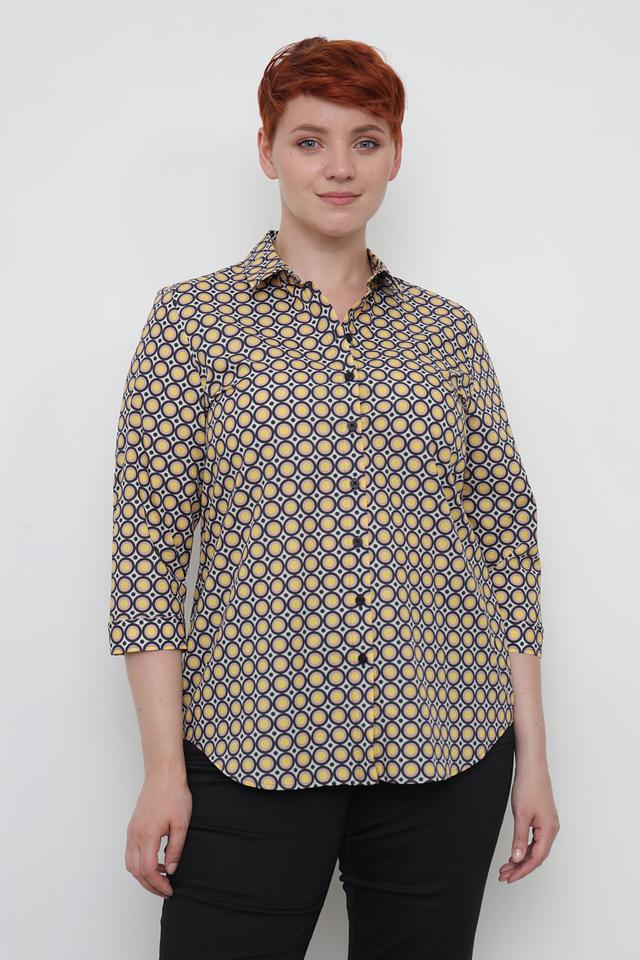 Женская рубашка Erfo жёлтого цвета с оригинальным геометрическим принтом станет стильным дополнением к вашему гардеробу. Модель выполнена из 100% хлопка, обеспечивая комфорт в носке. Состав: хлопок 100%