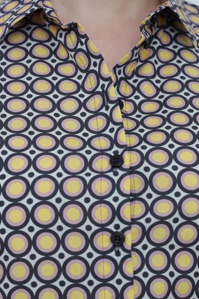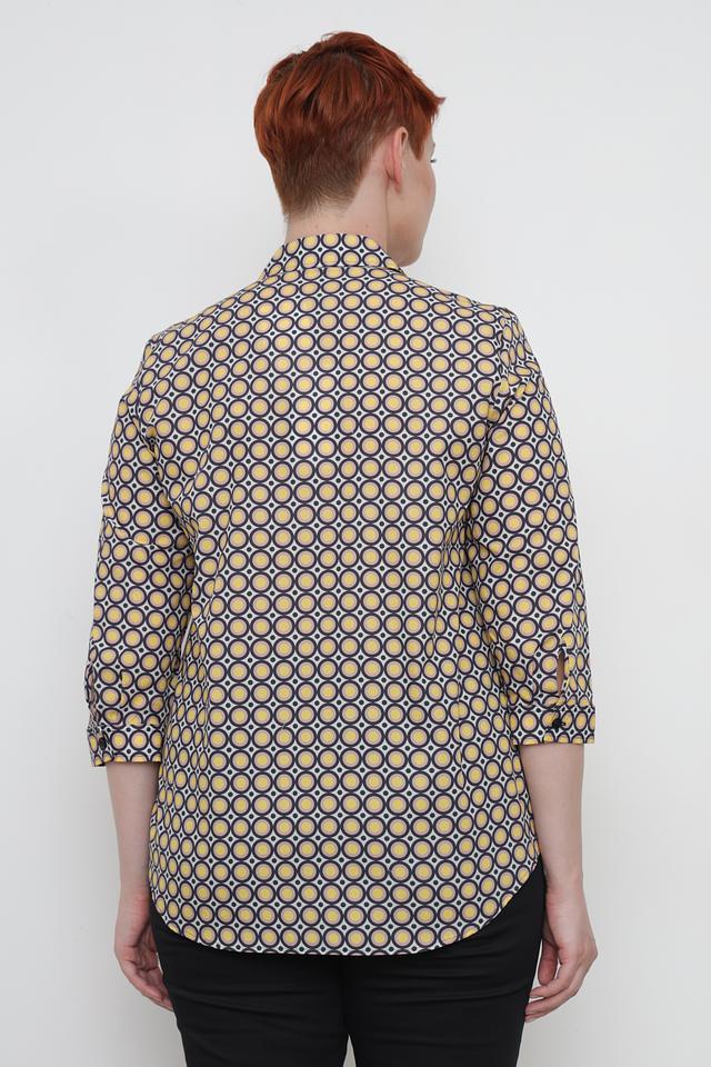 Рубашка имеет прямой крой, классический воротник и застежку на пуговицы. Особенностью модели является яркий геометрический принт, сочетающий в себе жёлтые и тёмно-синие оттенки на белом фоне. Рукава рубашки три четверти.