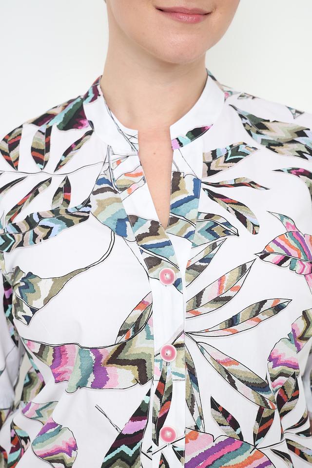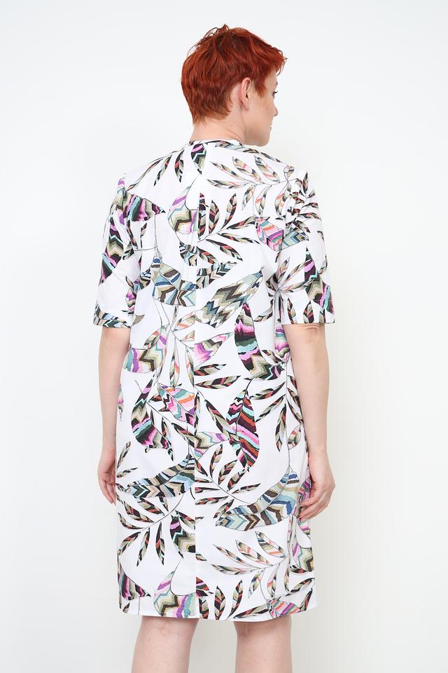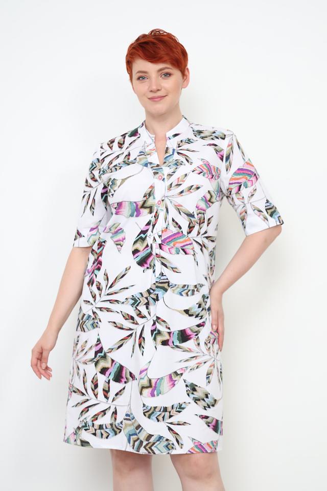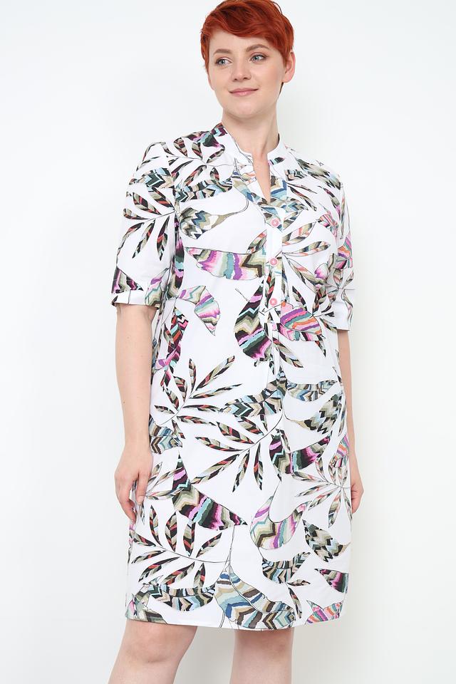 Основной цвет платья – белый, но оно украшено ярким и красочным цветочным принтом, состоящим из различных оттенков зелёного, розового, фиолетового и голубого. Принт выполнен в виде стилизованных листьев и цветов, создавая лёгкий и романтичный образ.