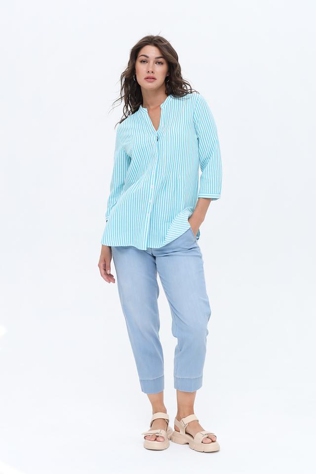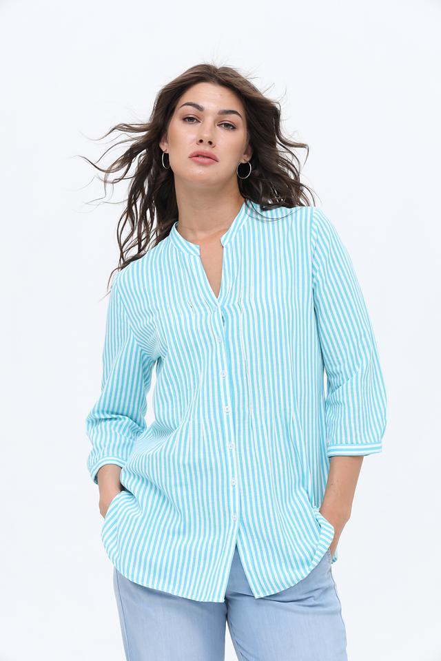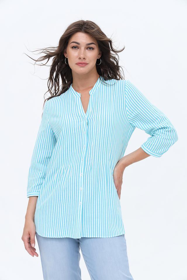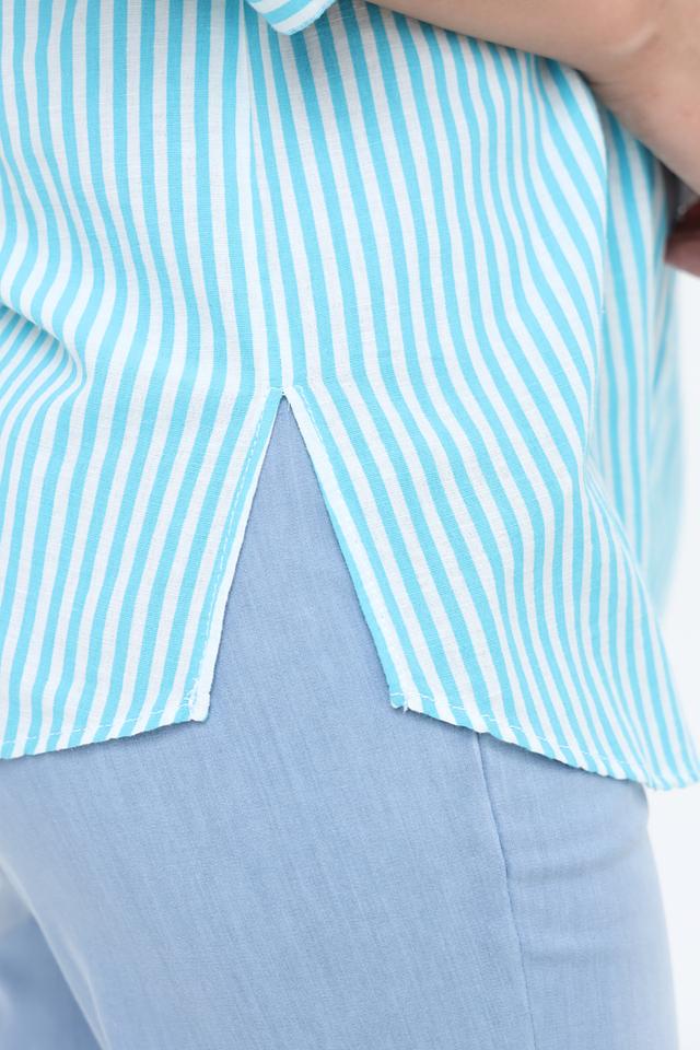 Голубая полоска придает блузе свежий и легкий вид. Боковые разрезы на подоле добавляют динамики и оригинальности. Состав ткани: 69% хлопок, 31% лен.