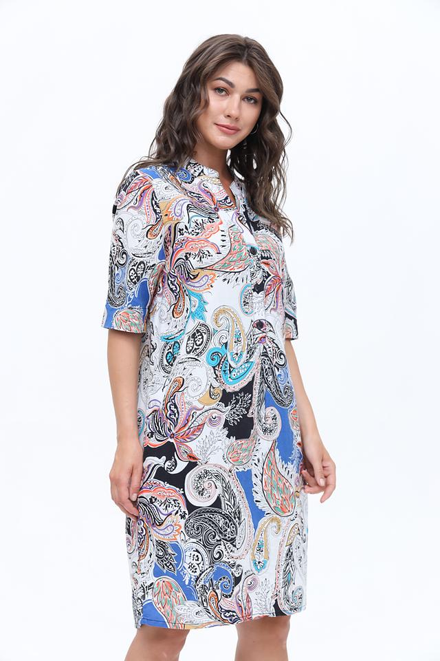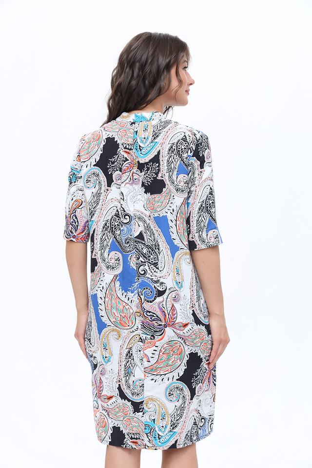 Платье имеет яркий и запоминающийся принт в стиле пейсли, выполненный в сочетании голубого, оранжевого, черного и белого цветов. V-образный вырез горловины и короткие рукава придают платью лёгкость и непринуждённость.