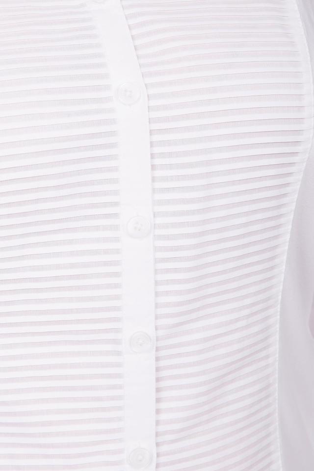 Белая блуза от Erfo с вертикальной полоской и застежкой на пуговицы. Изготовлена из хлопка с добавлением эластана, что обеспечивает комфорт и хорошую посадку по фигуре. Стильный и универсальный вариант для создания повседневных образов. Состав: хлопок 93%, эластан 7%