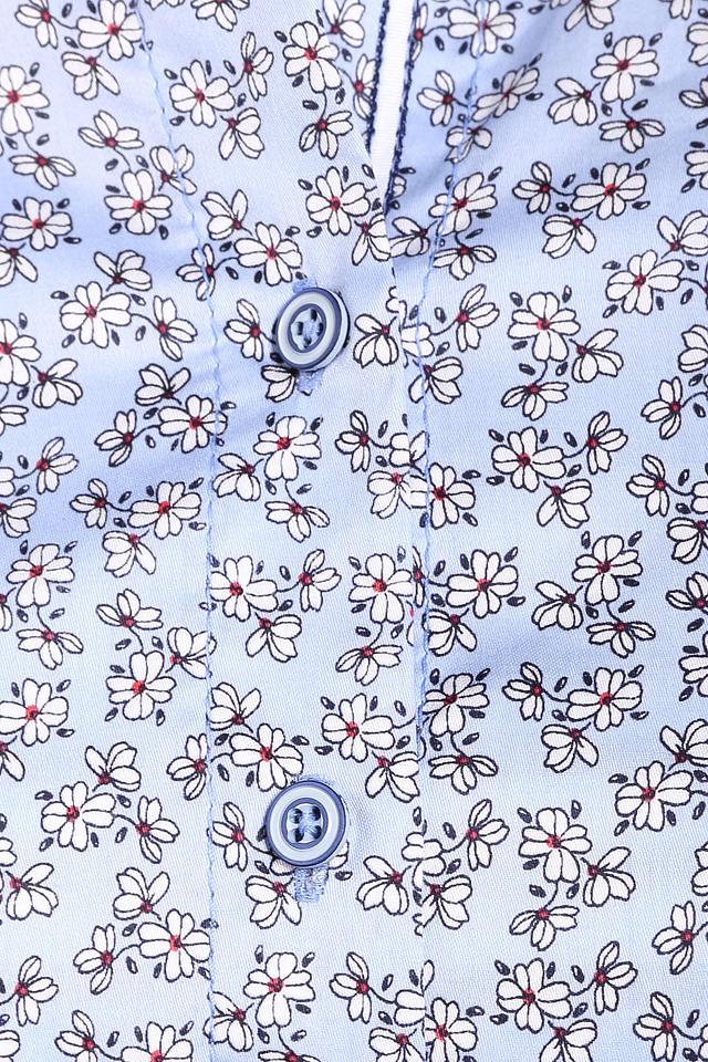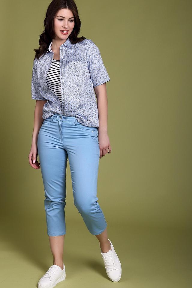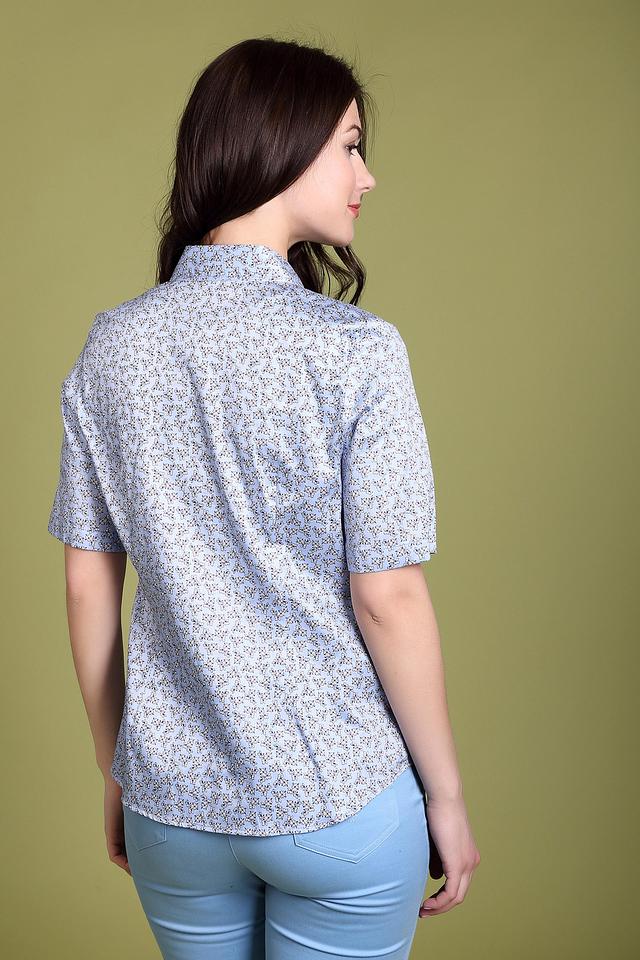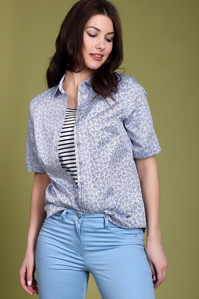Женская блуза Erfo голубого цвета с нежным цветочным принтом. Модель с короткими рукавами и застежкой на пуговицы, выполнена из 100% хлопка. Состав: хлопок 100%