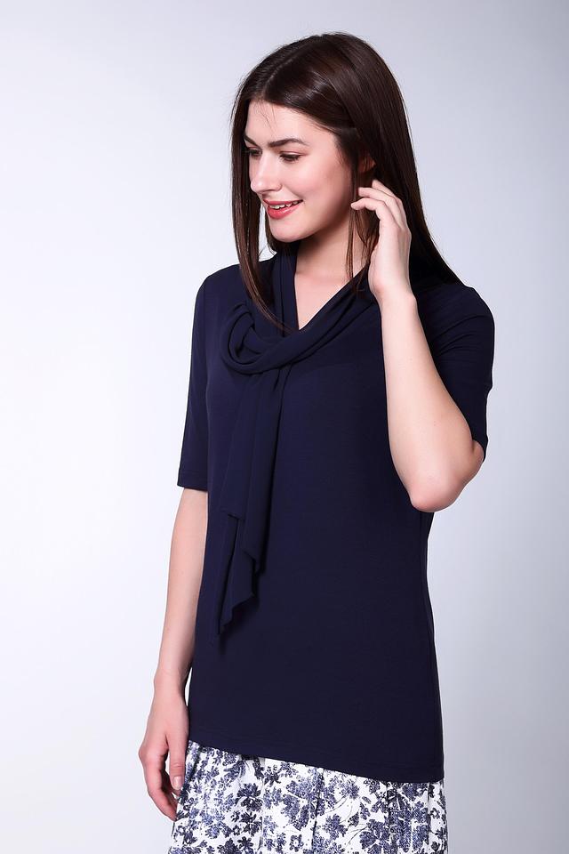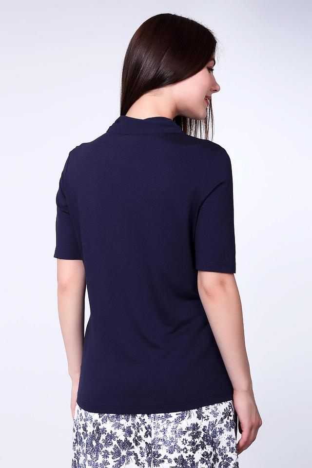 Блуза синего цвета фирмы Erfo. Ткань состоит из 4% эластана и 96% вискозы. Модель дополнена V - образным воротом, обшит широкой тесьмой, короткими втачными рукавами. Изделие выполнено прямым покроем. Блуза изготовлена из эластичного материала, подчеркивает фигуру и позволяет свободно двигаться. Тесьмой, расположенной на вороте, можно создавать различные способы завязывания и это всегда будет вносить разнообразие в вашем образе. Синий цвет универсален в подборе деталей для различных мероприятий.