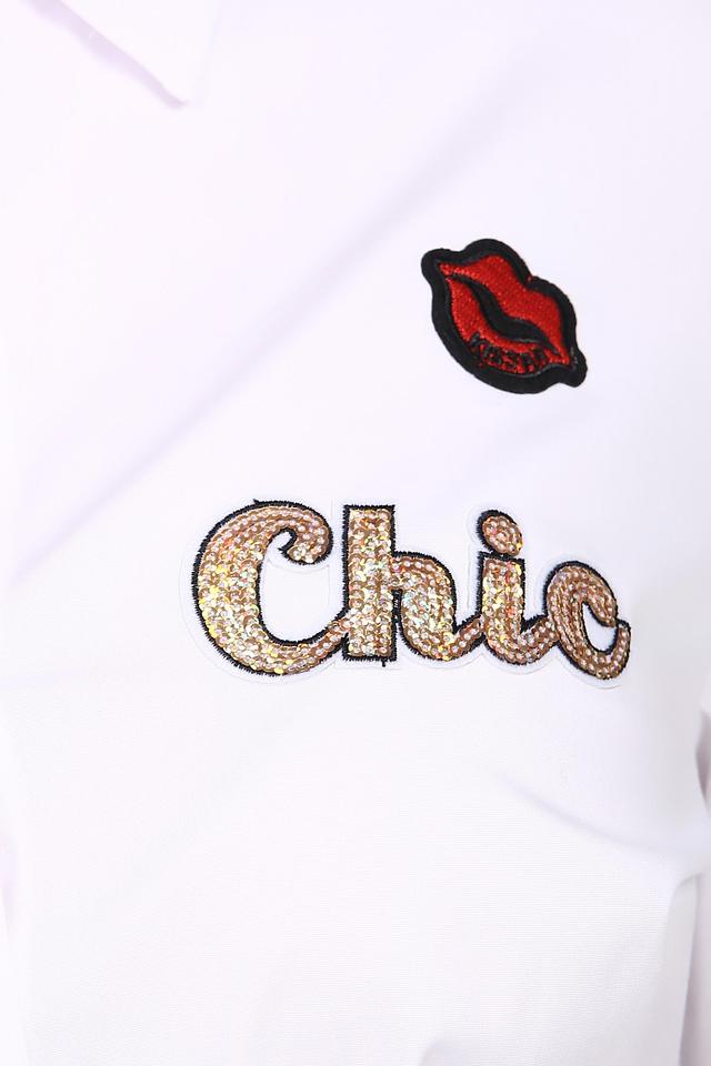Белая блуза от Erfo, украшенная яркой вышивкой в виде надписи "Chic" и аппликаций. Классический крой и натуральный состав делают эту блузу комфортной и стильной. Состав: хлопок 97%, полиэстер 3%