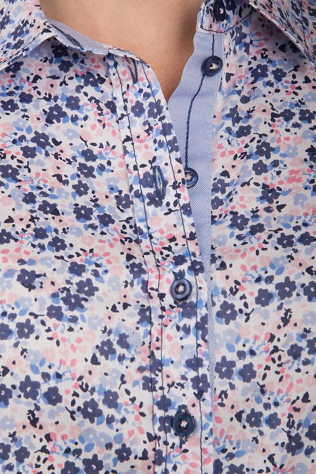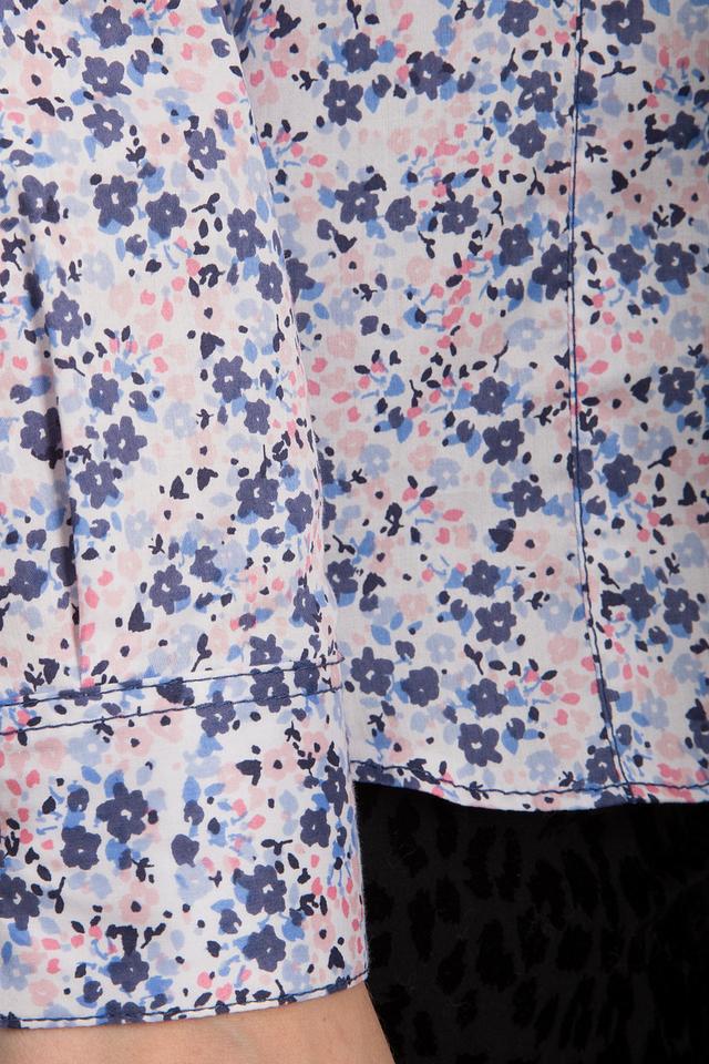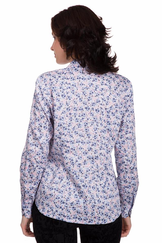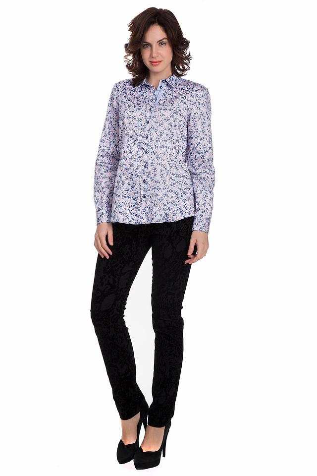 Блуза имеет классический крой с длинными рукавами и отложным воротником. Она украшена очаровательным цветочным принтом, выполненным в нежных оттенках голубого, розового и синего. Застежка на пуговицы обеспечивает удобство надевания и снятия.