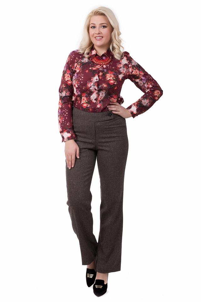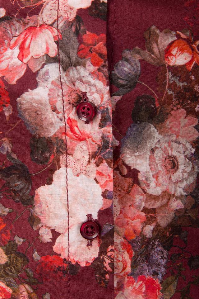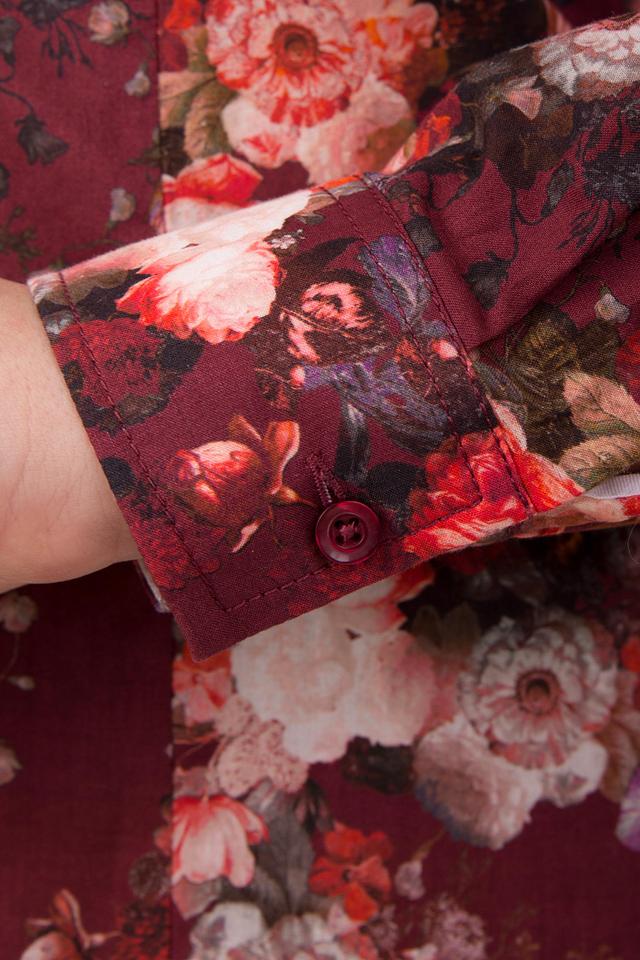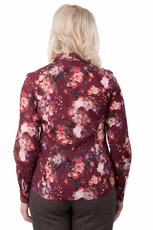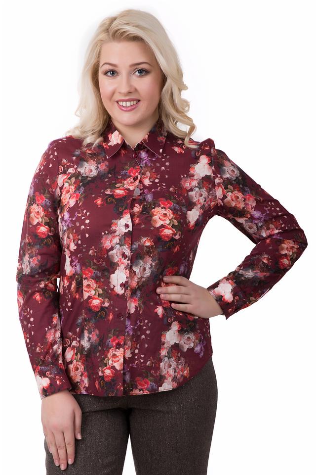 Блуза имеет классический крой с длинными рукавами и отложным воротником. Застежка на пуговицы, выполненные в тон принта, добавляет изысканности. Яркий цветочный принт на бордовом фоне делает эту модель особенно привлекательной и запоминающейся.