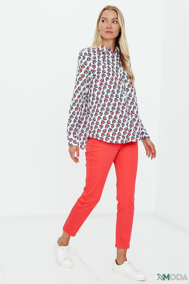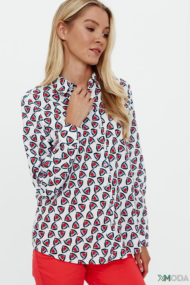 Рубашка имеет классический крой с длинными рукавами и отложным воротником. Её особенностью является оригинальный принт, состоящий из геометрических фигур в красных и синих тонах на белом фоне. Эта деталь делает рубашку уникальной и привлекательной.
