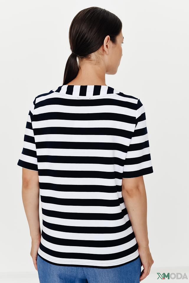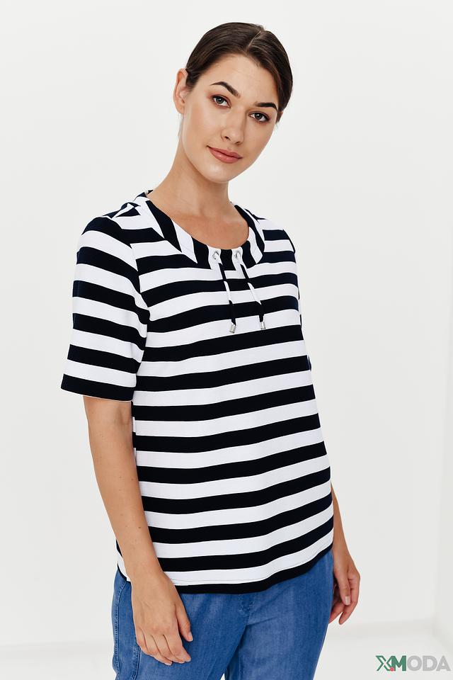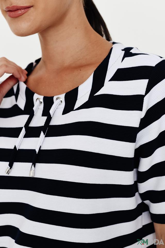 Блуза Erfo чёрно-белого цвета с коротким рукавом и оригинальным вырезом. Модель выполнена в полоску и дополнена шнуровкой, что придает ей особый шарм и стиль. Состав: хлопок 73%, полиэстер 24%, эластан 3%