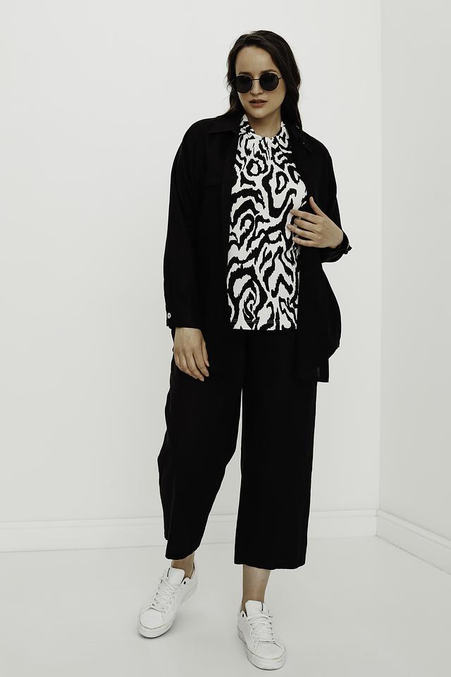 Этот стильный топ от Erfo выполнен в белом цвете и украшен эффектным принтом, имитирующим шкуру зебры. Модель имеет свободный крой, который обеспечивает комфорт в носке, и округлый вырез горловины, который подчеркивает женственность.