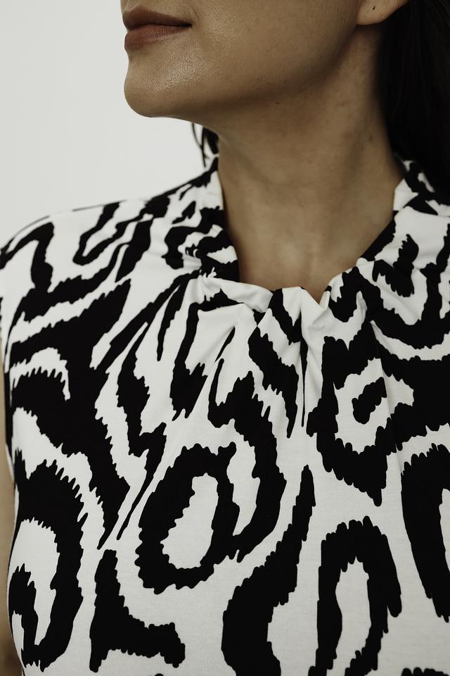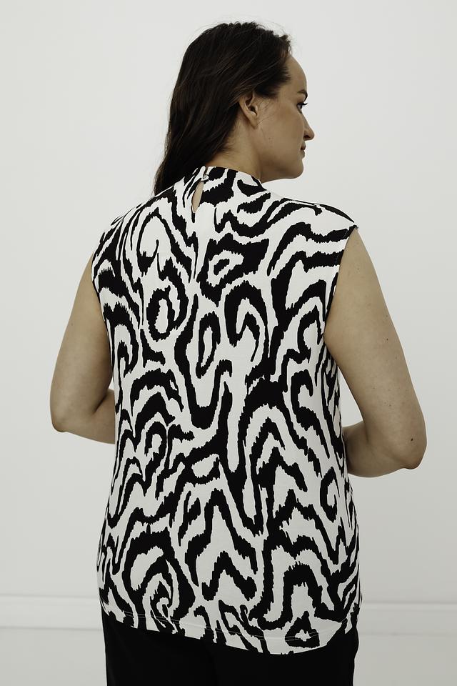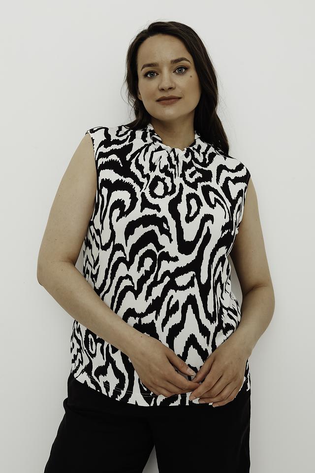 Топ Erfo белого цвета с оригинальным принтом "зебра" станет стильным дополнением к вашему гардеробу. Модель без рукавов с округлым вырезом горловины выполнена из мягкой и приятной к телу вискозы с добавлением эластана. Состав: вискоза 94%, эластан 6%