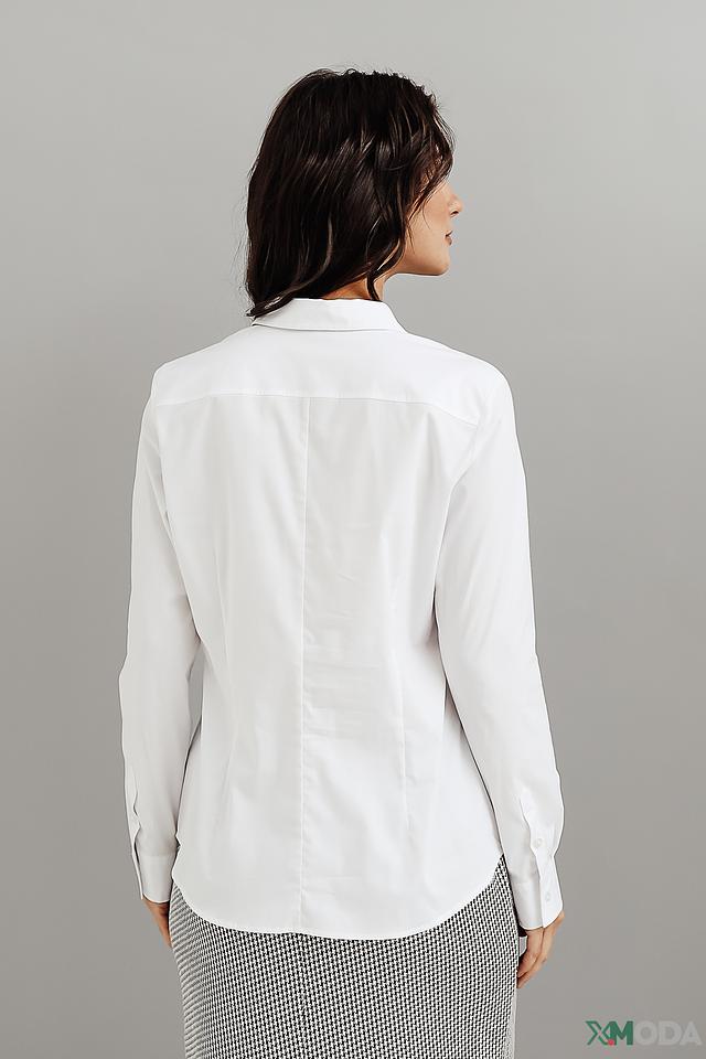 Приталенный силуэт подчеркивает фигуру, а классический воротник и длинные рукава придают образу элегантность. Рубашка застегивается на пуговицы по всей длине.