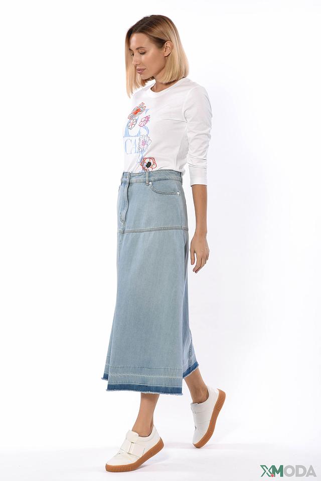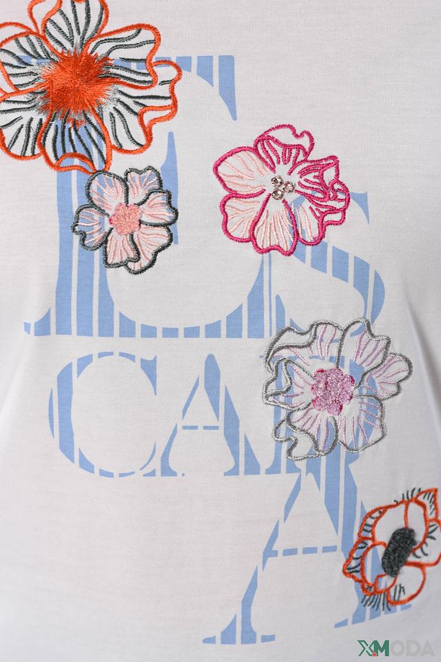 Основной цвет футболки – белый, который служит идеальным фоном для яркой и детализированной цветочной вышивки. Вышивка выполнена в различных оттенках: розового, оранжевого, голубого и зеленого, создавая эффектный и запоминающийся образ.