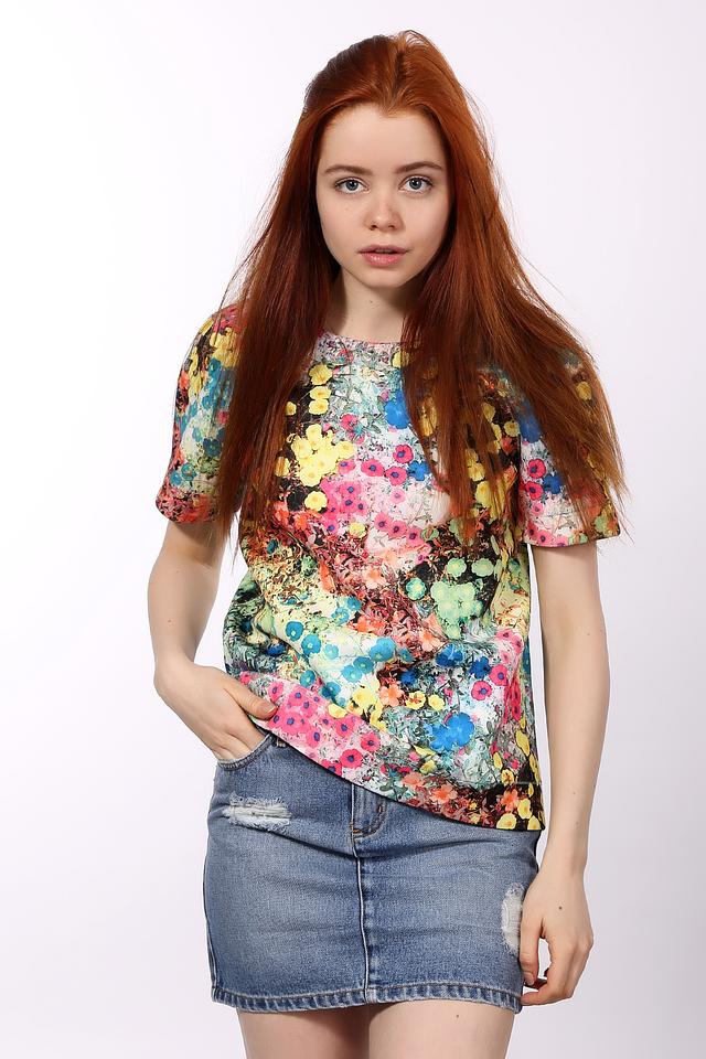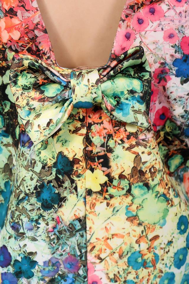 Блуза имеет короткие рукава и V-образный вырез горловины. Главной особенностью является эффектный цветочный принт, который сочетает в себе множество ярких оттенков. Декоративный бант на спине добавляет образу женственности и изысканности.