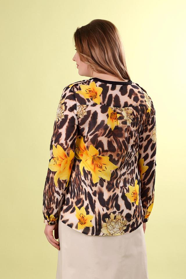 - Принт: Яркий и запоминающийся леопардовый принт с цветочными элементами делает эту блузу особенной и привлекательной.