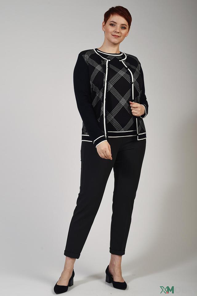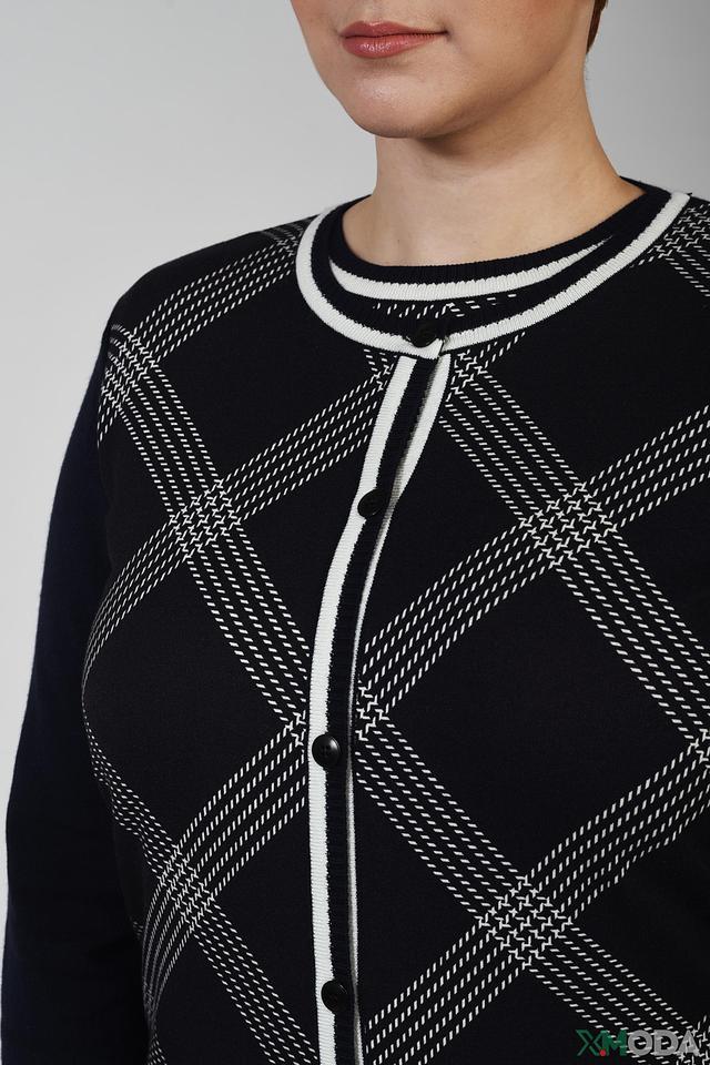 Жакет имеет классический крой с длинными рукавами и застёжкой на пуговицы. Белоснежный узор в клетку эффектно выделяется на тёмном фоне, создавая стильный контраст. Модель идеально сочетается с брюками, юбками и платьями.