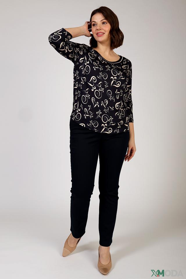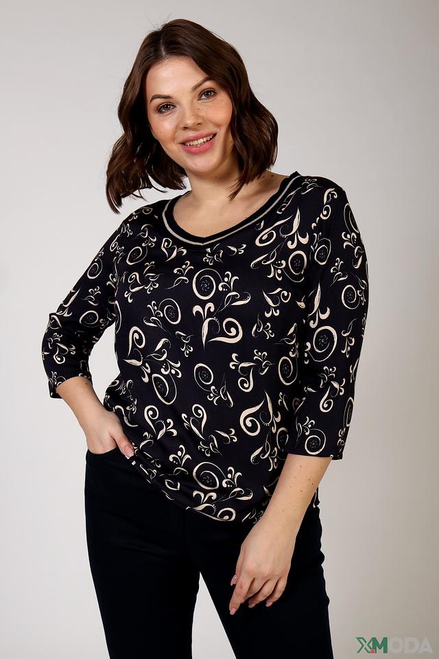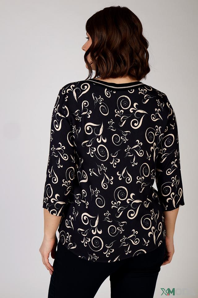 Блуза имеет прямой крой и короткие рукава, что обеспечивает свободу движений. Особенностью модели является оригинальный узор в белых тонах на черном фоне, который придает ей изысканность и неповторимость.