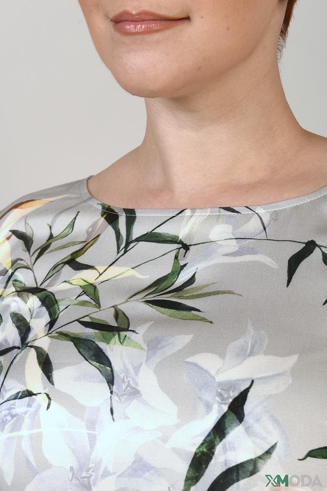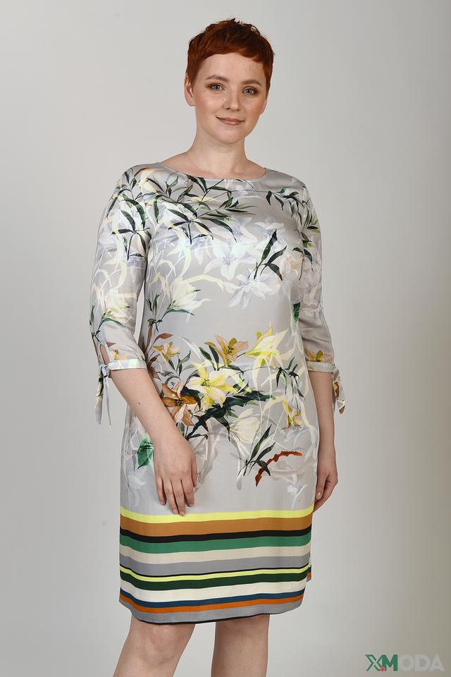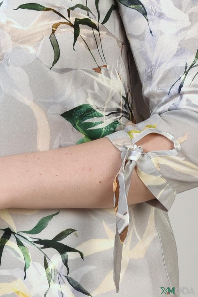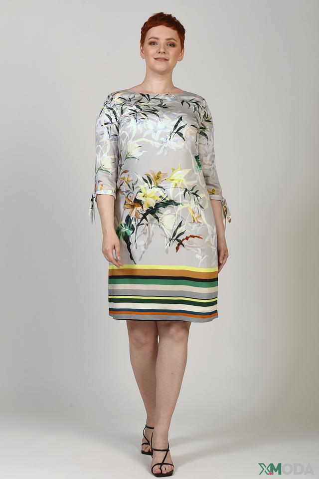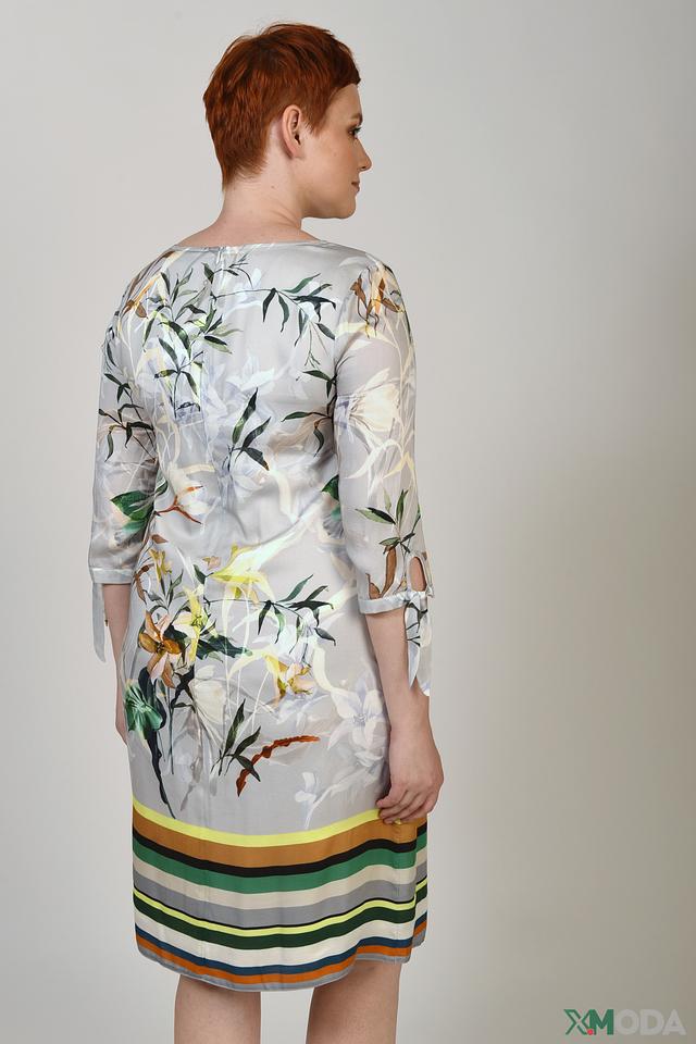 Основной цвет платья – светло-серый, который служит идеальным фоном для яркого цветочного принта. Принт выполнен в нежных оттенках жёлтого, зелёного и белого, создавая свежий и романтичный образ. Нижняя часть платья украшена горизонтальными полосами в сочетании зелёного, оранжевого и серого цветов.