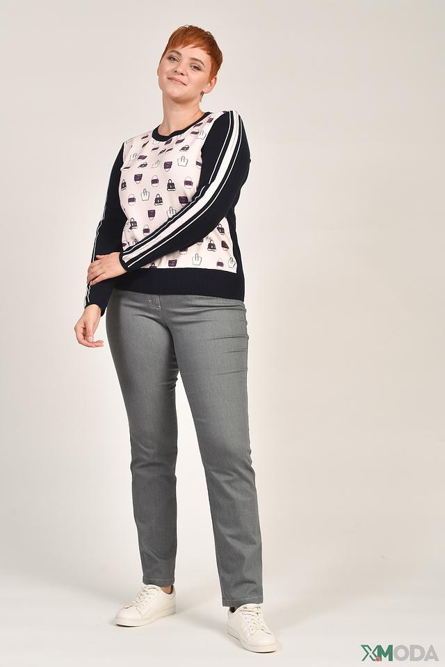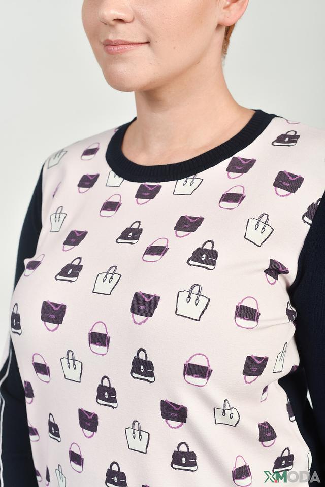 Женский пуловер Eugen Klein бежевого цвета с оригинальным принтом сумок и контрастными черными вставками. Модель выполнена из мягкого и приятного к телу трикотажа, украшена белыми полосками на рукавах. Состав: модал 46%, полиакрил 40%, полиамид 14%
