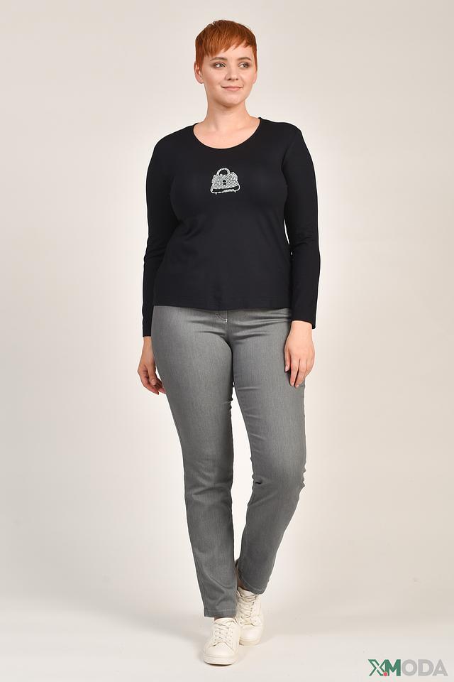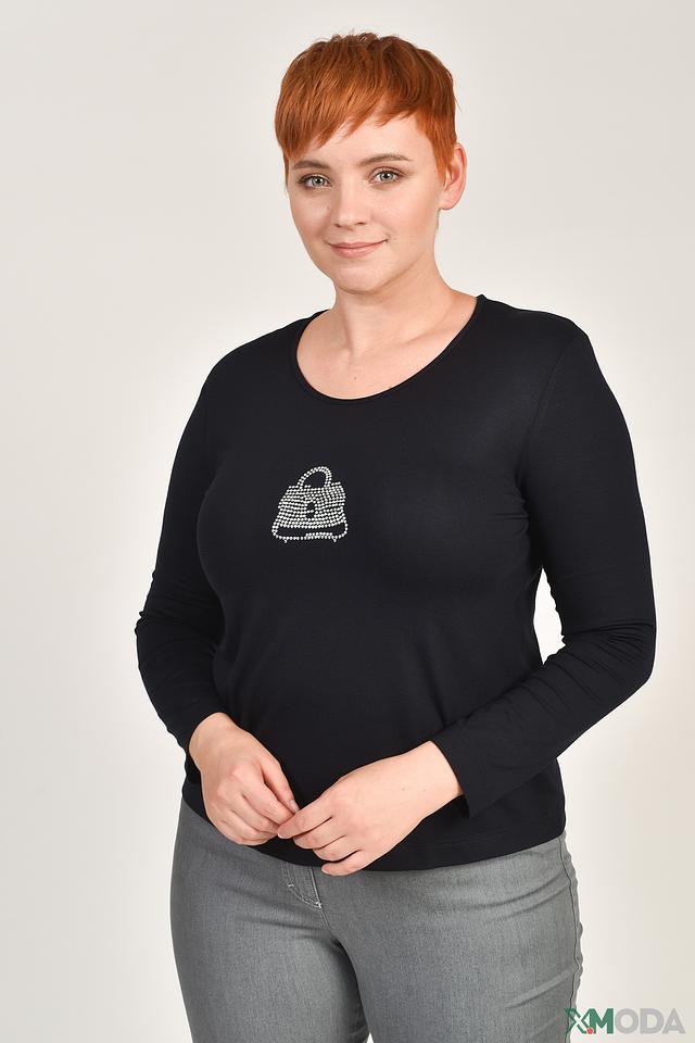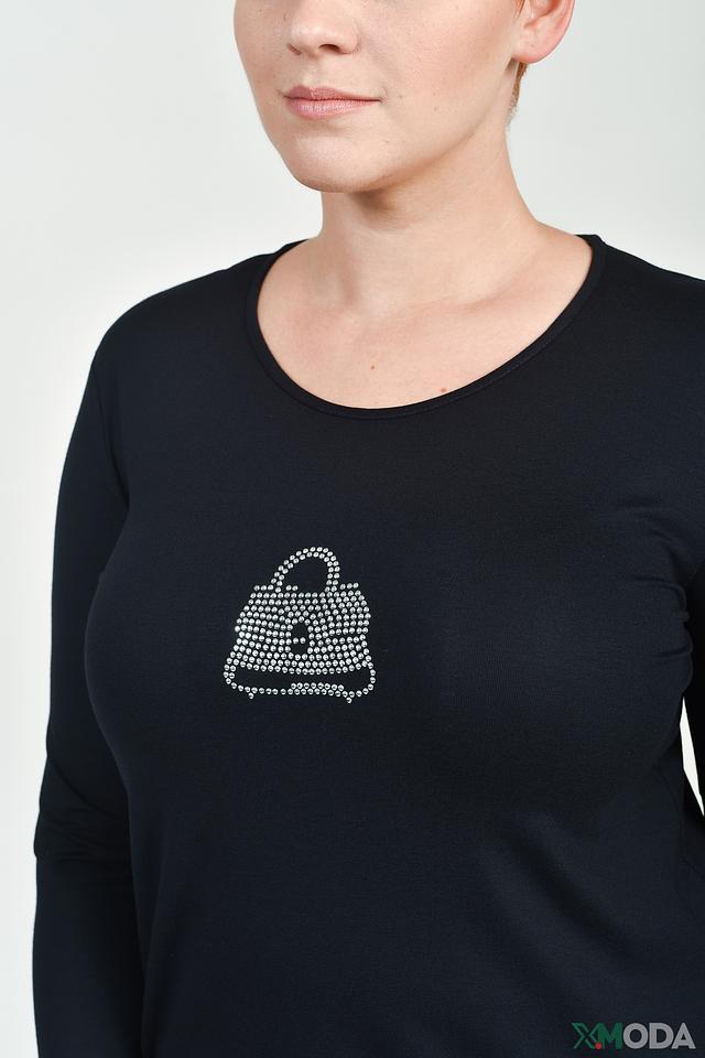 Особенностью этого лонгслива является оригинальный принт на лицевой стороне, изображающий стильную сумку, выполненный с использованием декоративных элементов, имитирующих стразы. Круглый вырез горловины и длинные рукава делают его универсальным для различных образов.