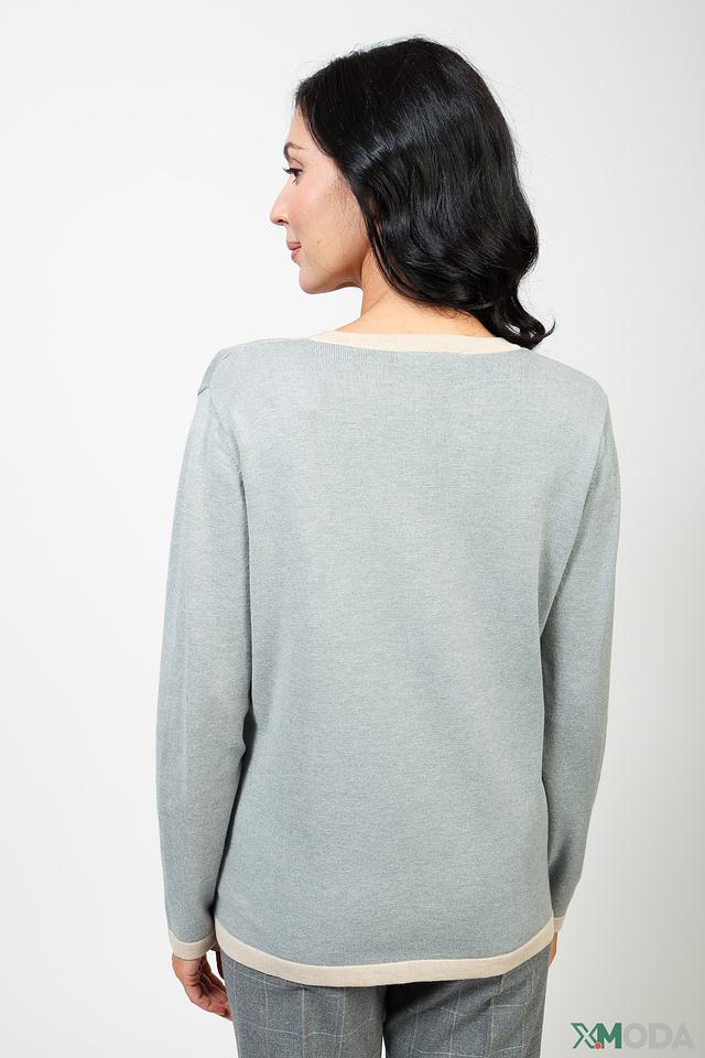 Жакет имеет V-образный вырез и застегивается на ряд пуговиц. Рукава длинные, манжеты и планка выполнены в бежевом цвете, что создает контрастный и стильный эффект.