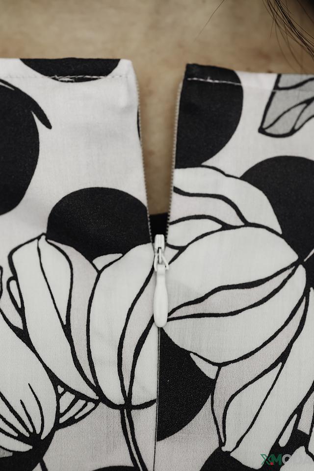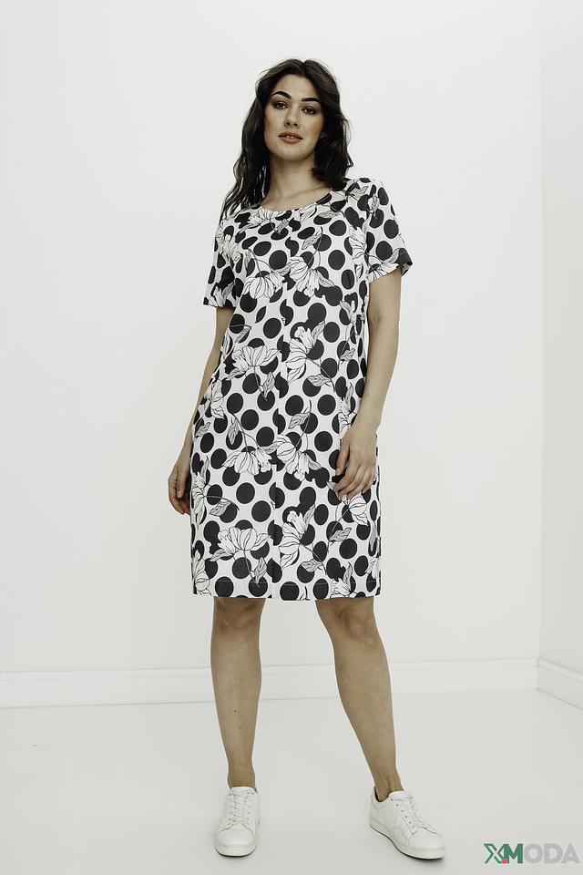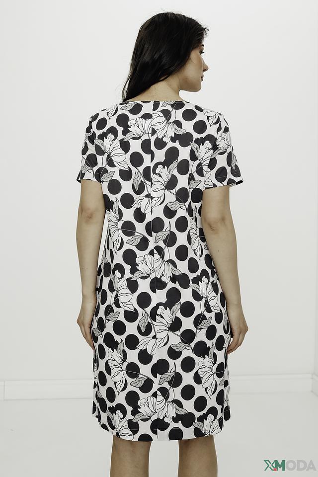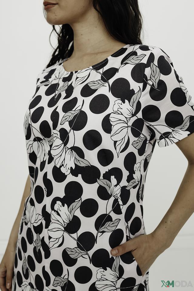 Платье имеет прямой силуэт и длину до колена. Короткие рукава делают его идеальным для теплой погоды. Основной цвет платья – белый, а принт выполнен в чёрном цвете в виде горошка и растительных элементов.