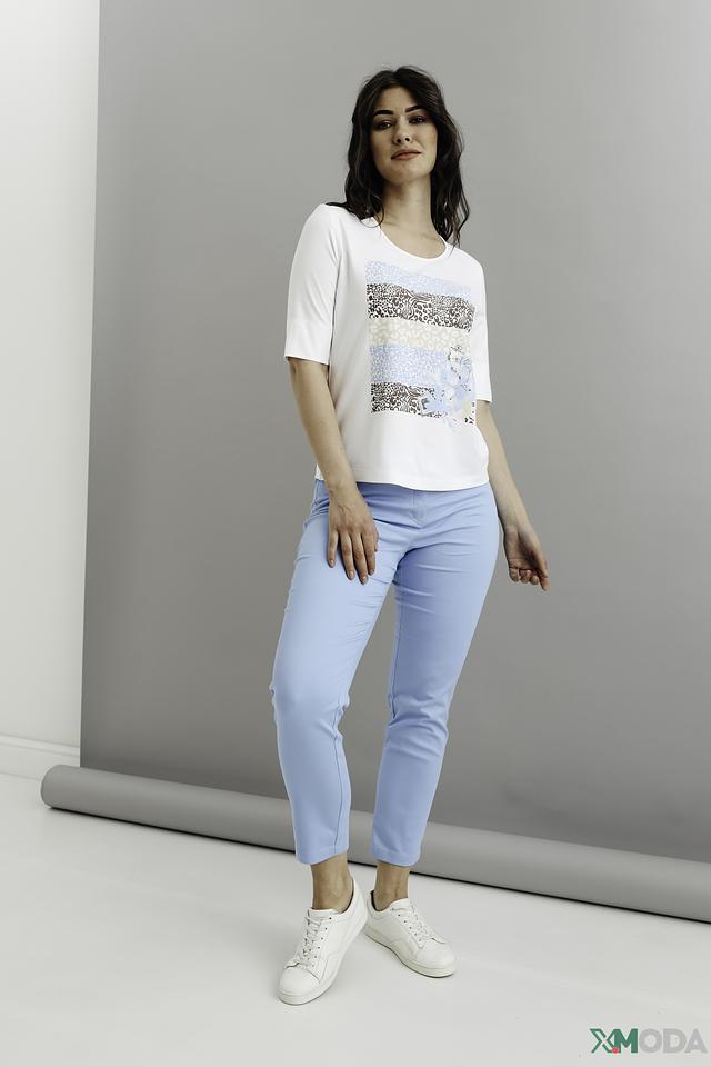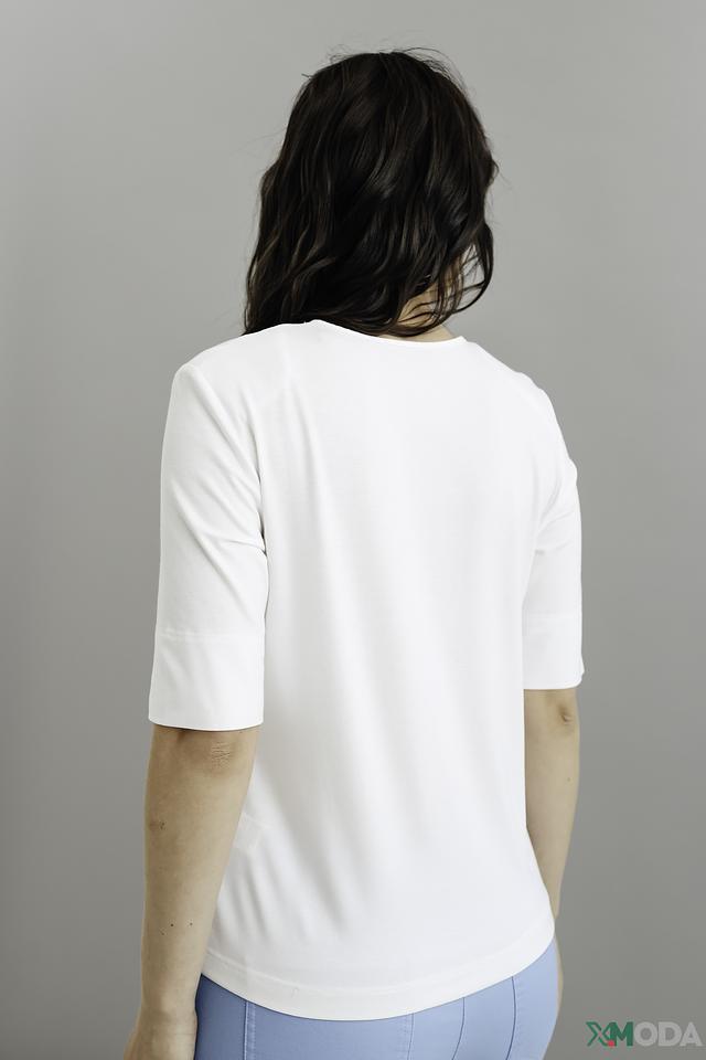 Модель имеет прямой крой, короткие рукава и круглый вырез горловины. Футболка изготовлена из высококачественной вискозы с добавлением эластана, что обеспечивает мягкость, приятные тактильные ощущения и хорошую посадку по фигуре.