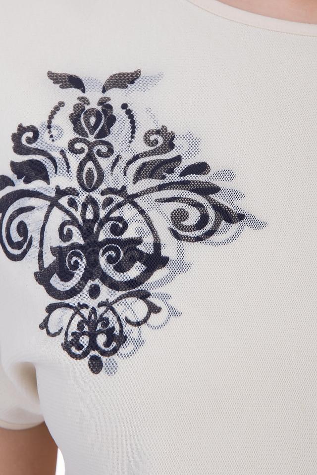 Эта блуза от Eugen Klein станет прекрасным дополнением к вашему гардеробу. Она выполнена в нежном бежевом цвете и украшена выразительным чёрным принтом, который придает ей особый шарм.