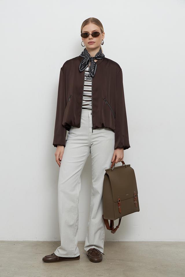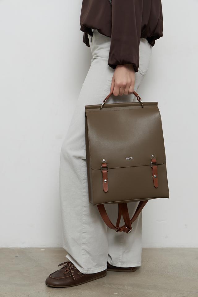 Рюкзак имеет прямоугольную форму и выполнен из искусственной кожи, что придает ему элегантный и современный вид. Отличительной особенностью является отделка из коричневой искусственной кожи на передней панели и лямках, а также декоративные элементы с металлическими застежками.
