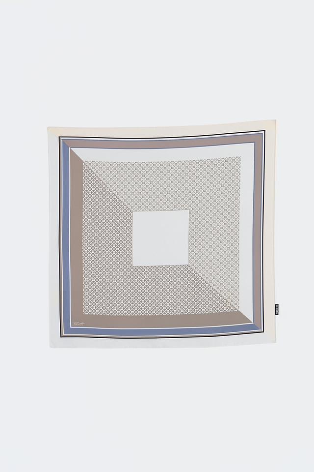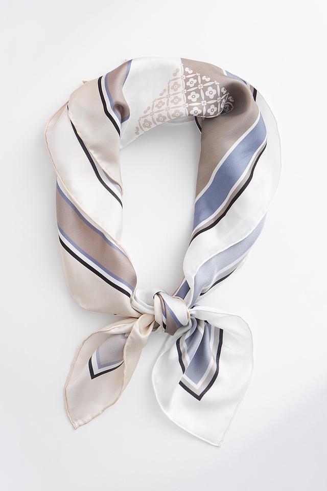 Шарф имеет полосатый узор, сочетающий в себе оттенки белого, серого и голубого, что придает ему особый шарм. Он идеально дополнит как повседневный, так и вечерний наряд, добавив образу элегантности и женственности.