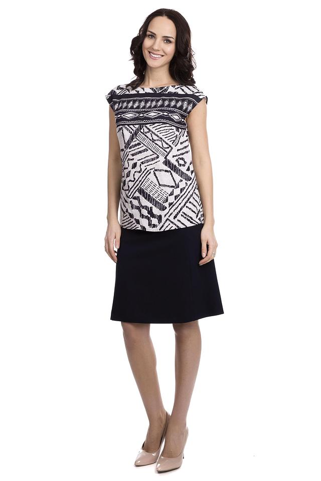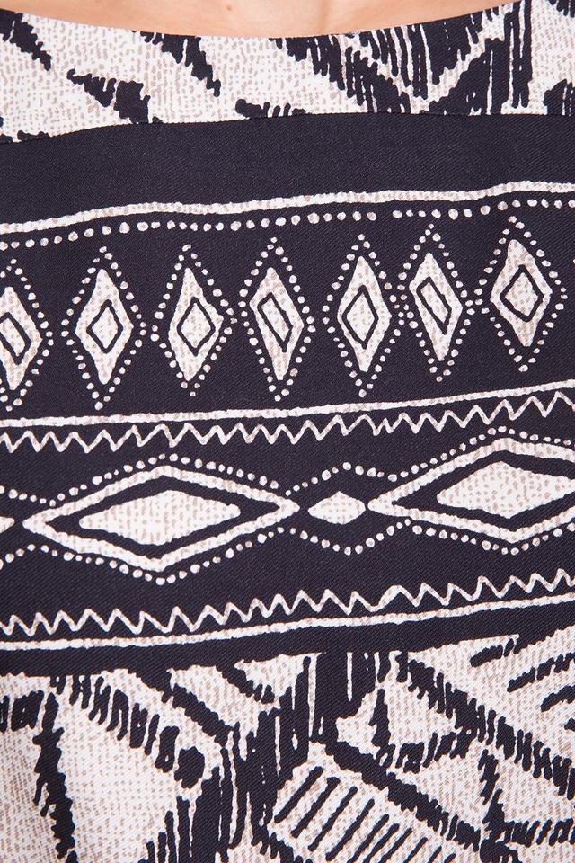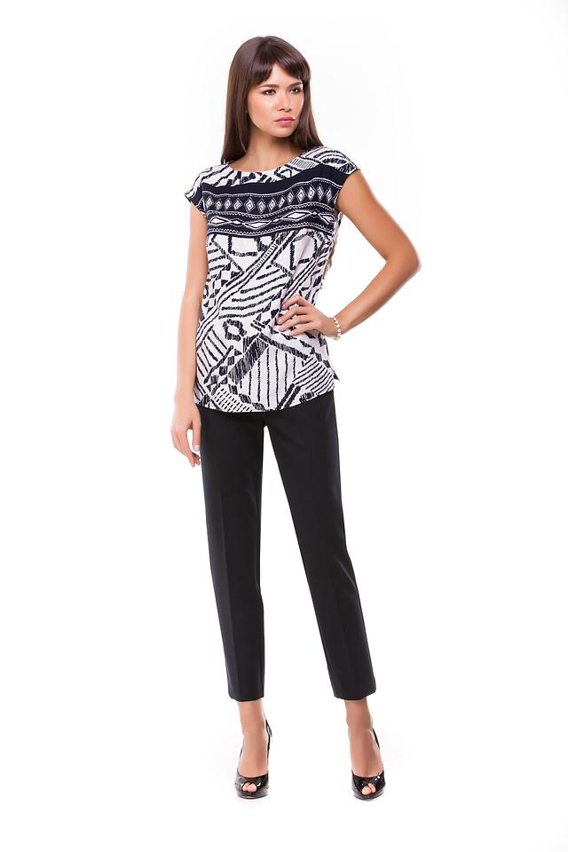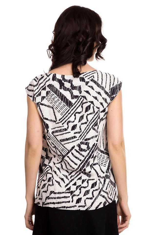 Основной цвет блузы – белый, но она украшена выразительным черным геометрическим принтом, который придает ей оригинальность и стиль. Принт покрывает всю верхнюю часть блузы, создавая яркий акцент.